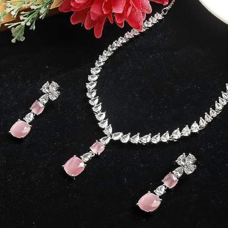 Gorgeous necklace and earrings set with pendulous design, studded with sparkling American diamonds. Perfect for special occasions.