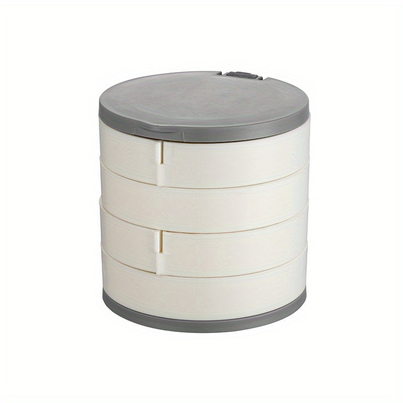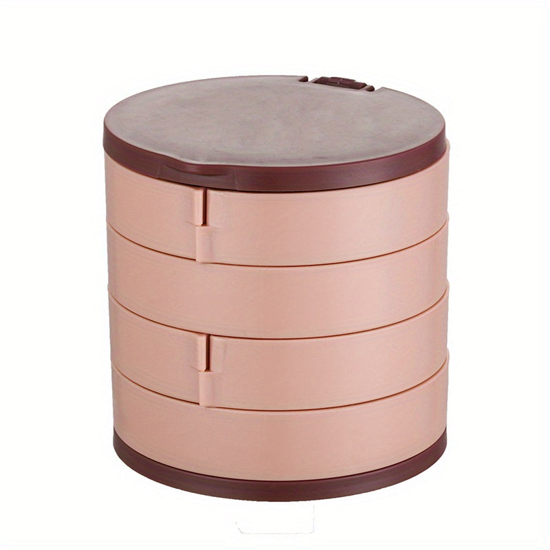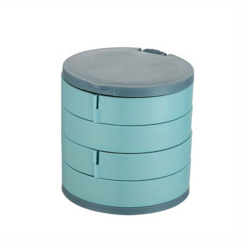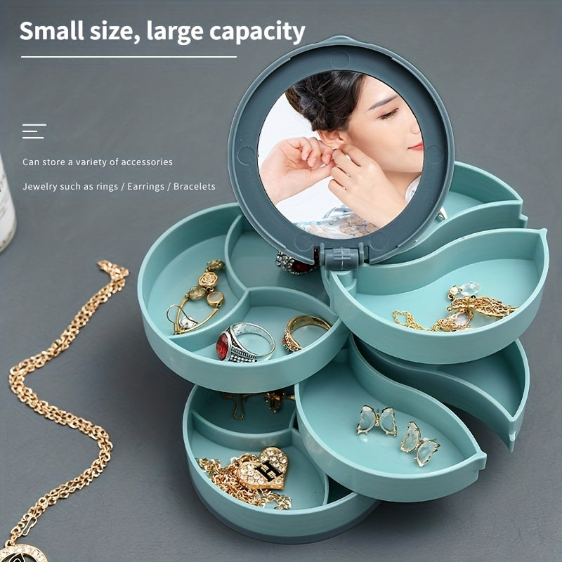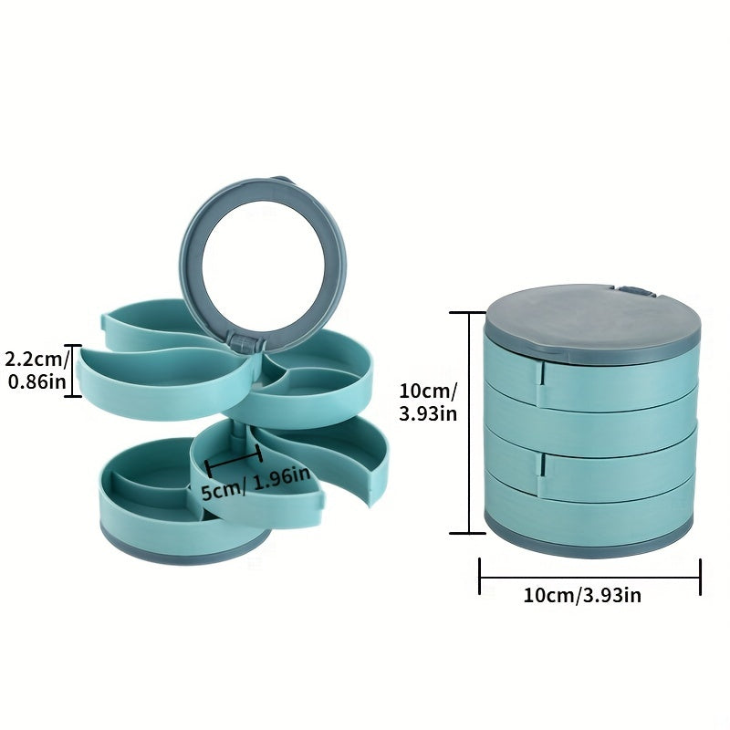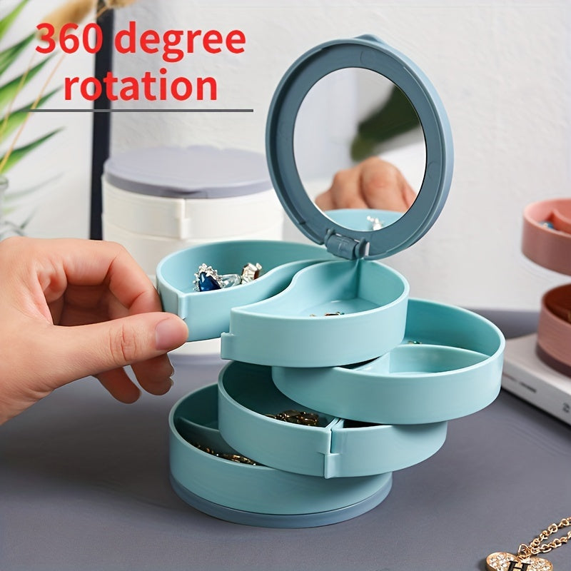 Keep your jewelry organized and easily accessible with this rotating storage box. It features a built-in mirror and compartments for earrings, rings, and necklaces.