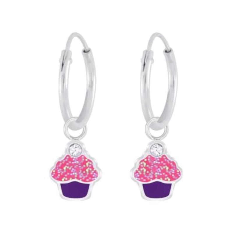 Add a touch of sweetness to your look with these sterling silver cupcake crystal charm hoop earrings. The dainty design is perfect for everyday wear. Hypoallergenic for sensitive ears.