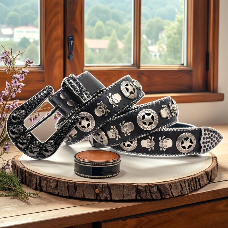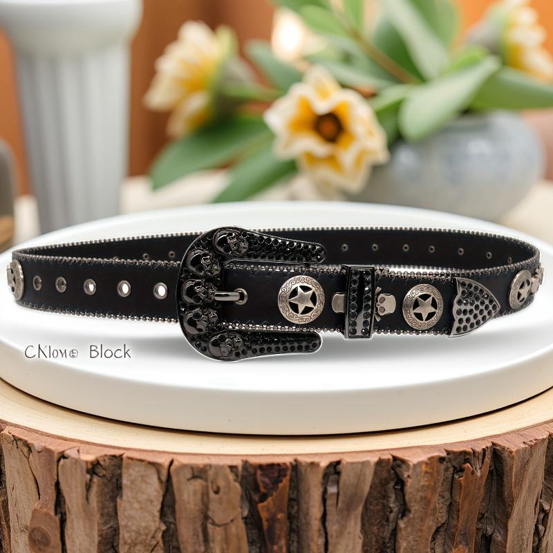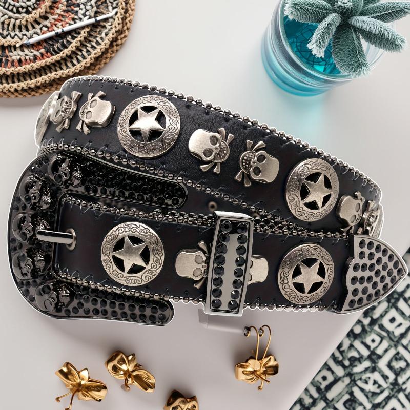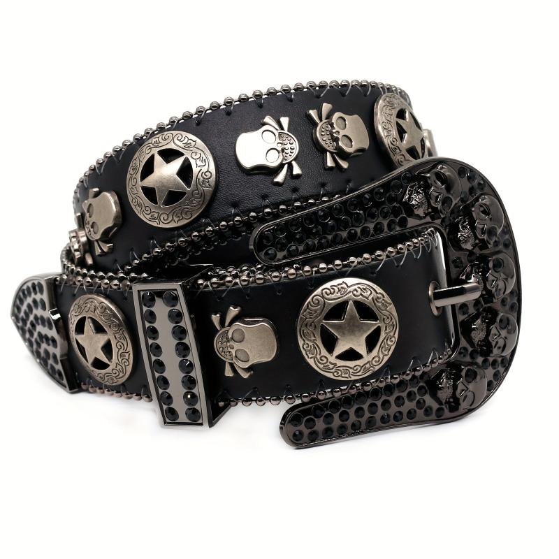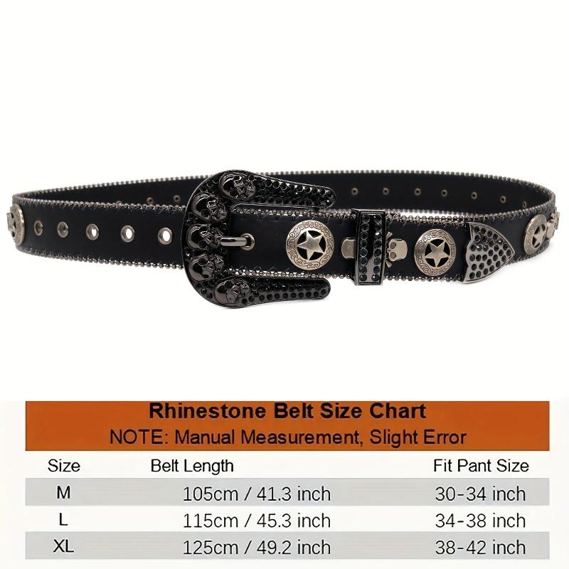 Add a touch of edgy style to your outfit with this skull belt featuring rhinestone hardware buckle and faux leather strap. Perfect for punk or motorcycle-inspired looks.