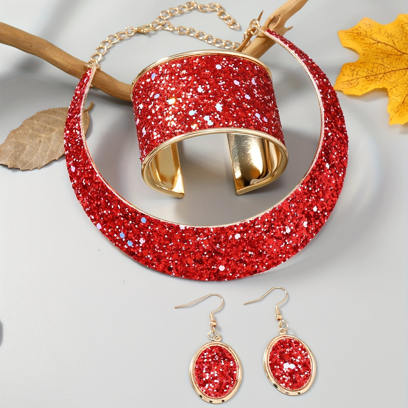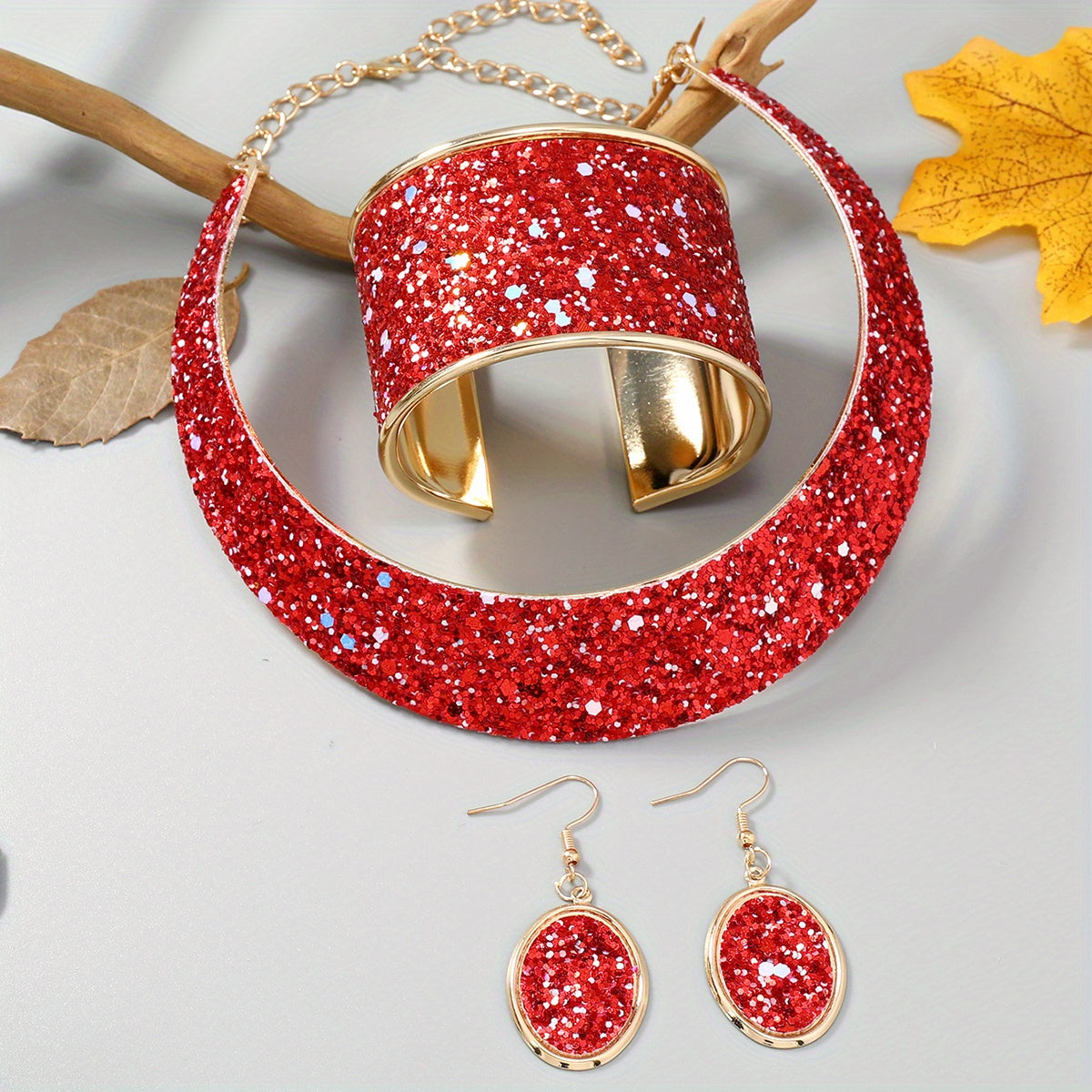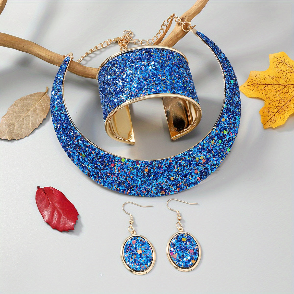 Elevate your party look with this stunning jewelry set that includes a choker necklace, drop earrings, and a cuff bangle bracelet. Perfect for adding sparkle and elegance to any outfit.