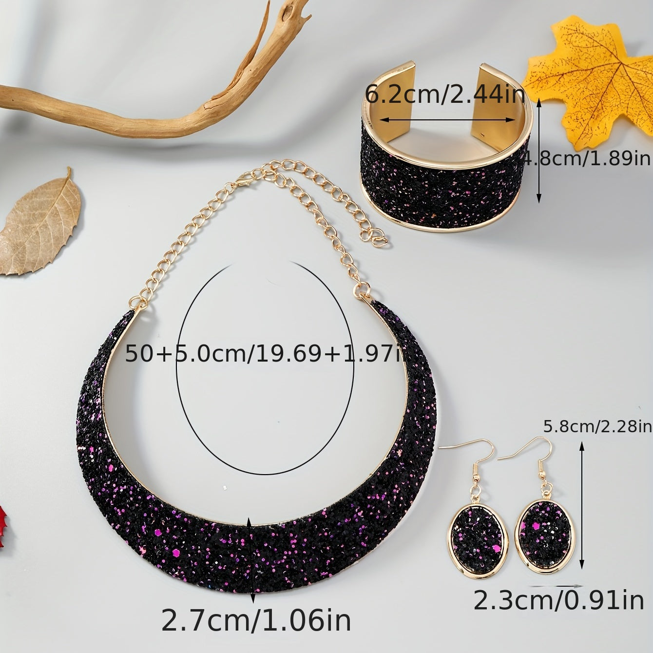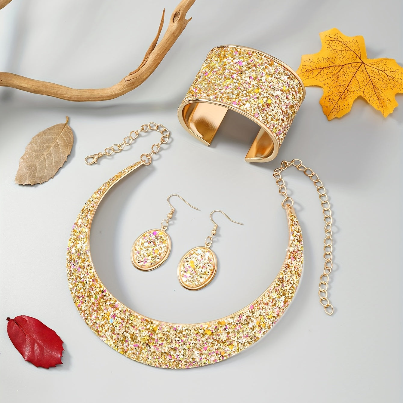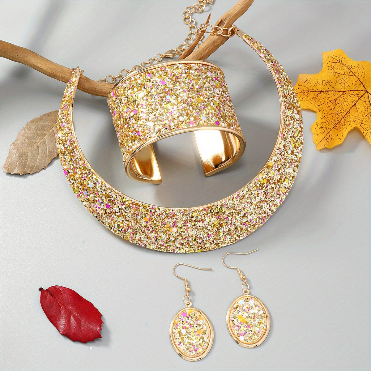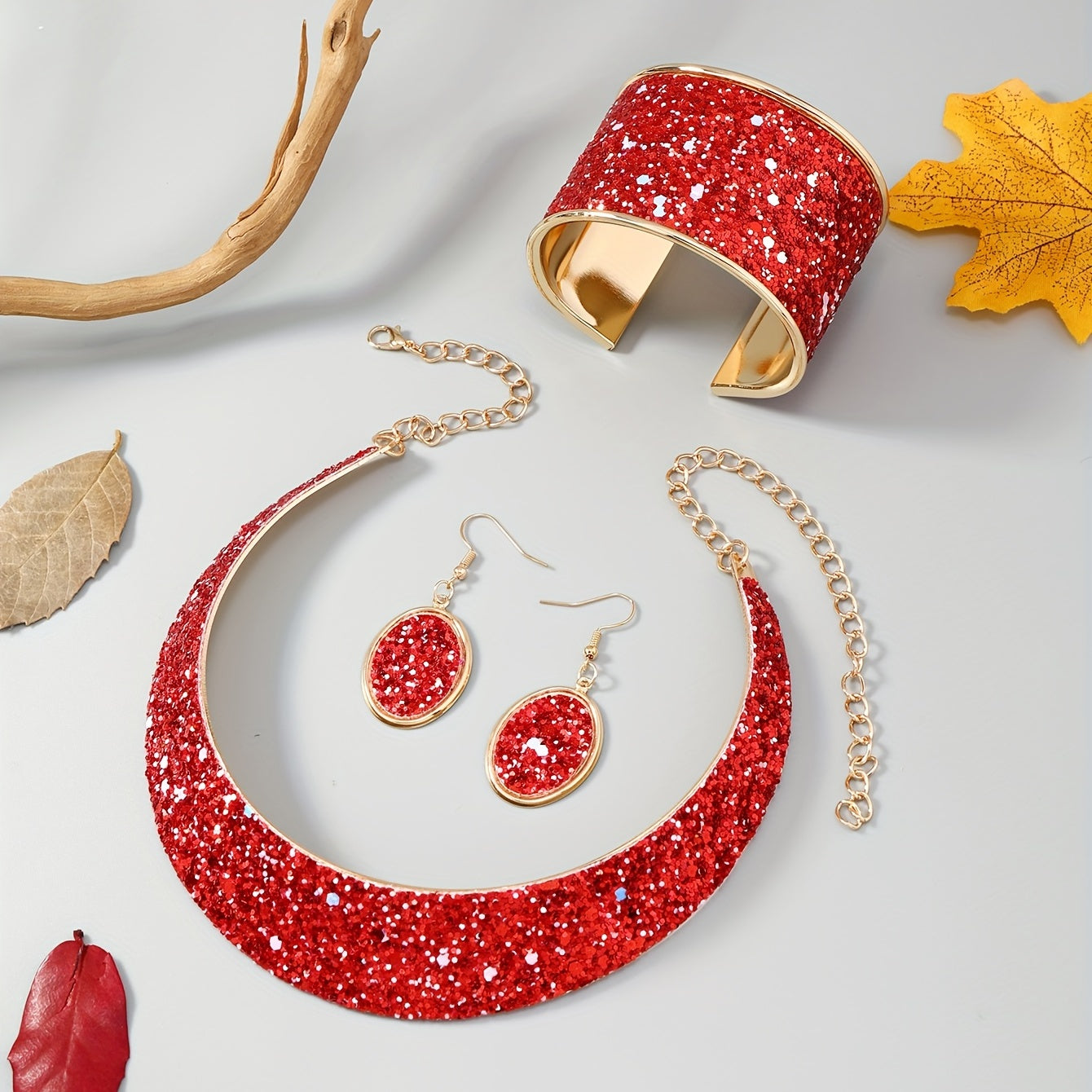 Elevate your party look with this stunning jewelry set that includes a choker necklace, drop earrings, and a cuff bangle bracelet. Perfect for adding sparkle and elegance to any outfit.