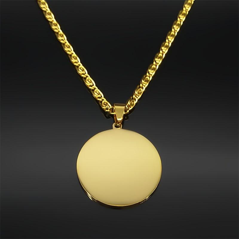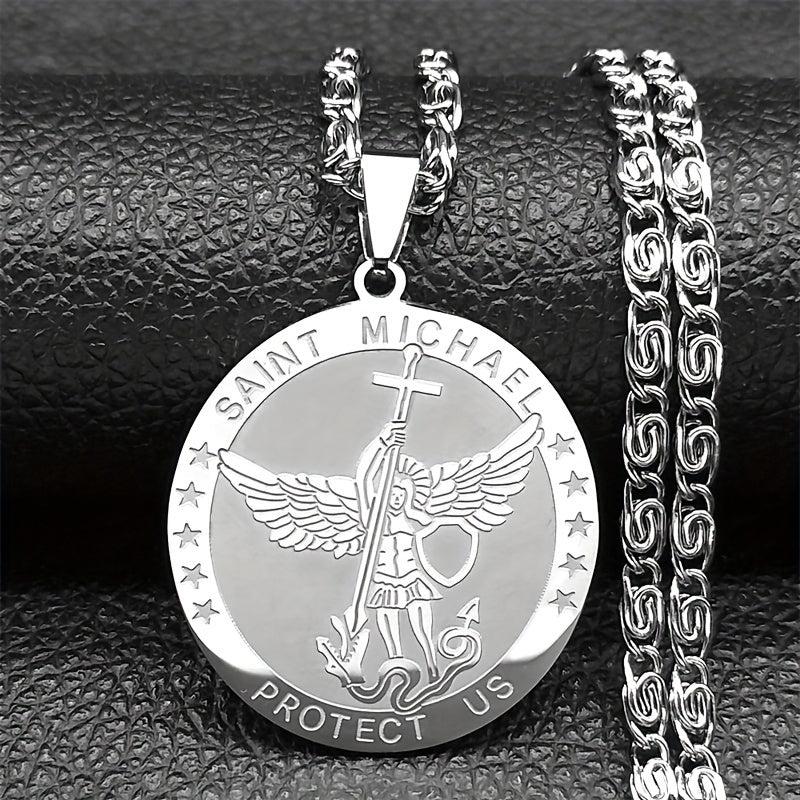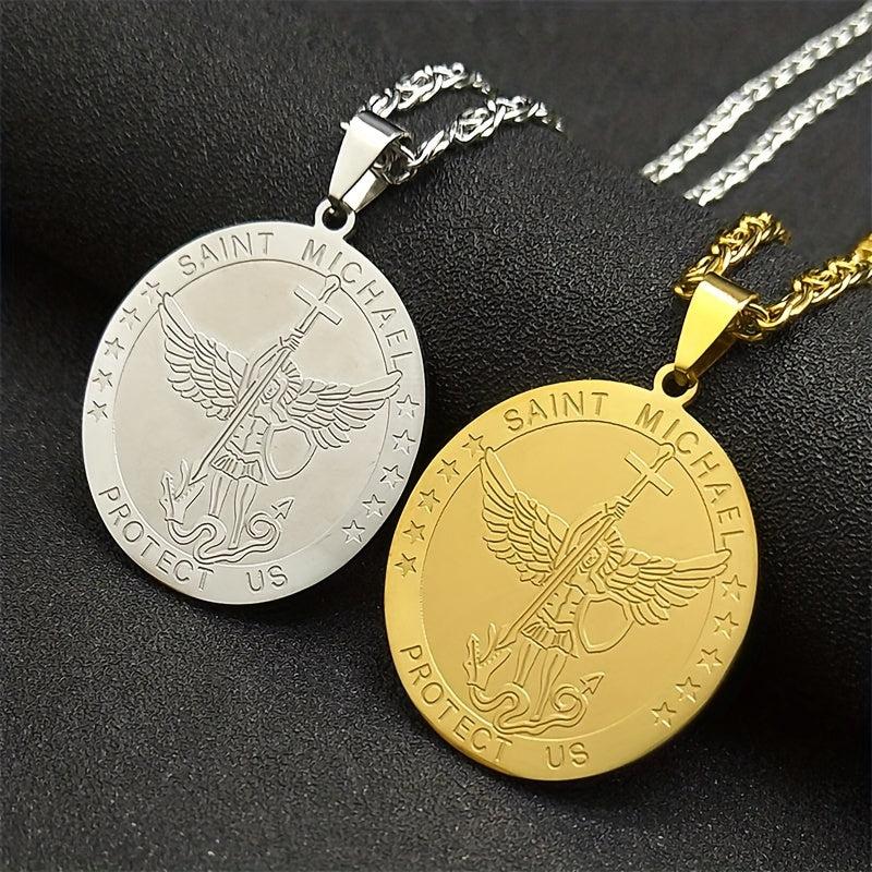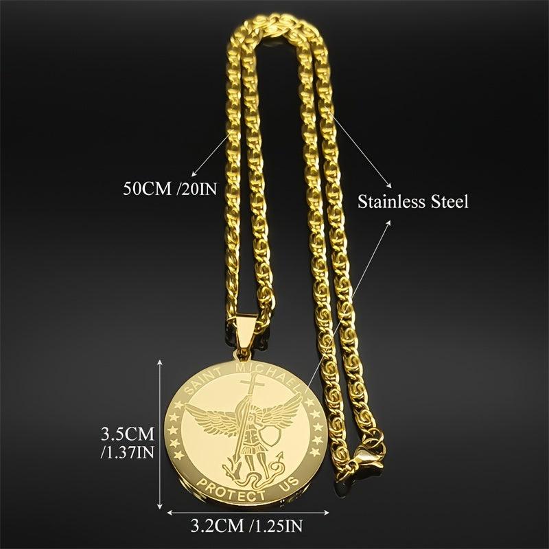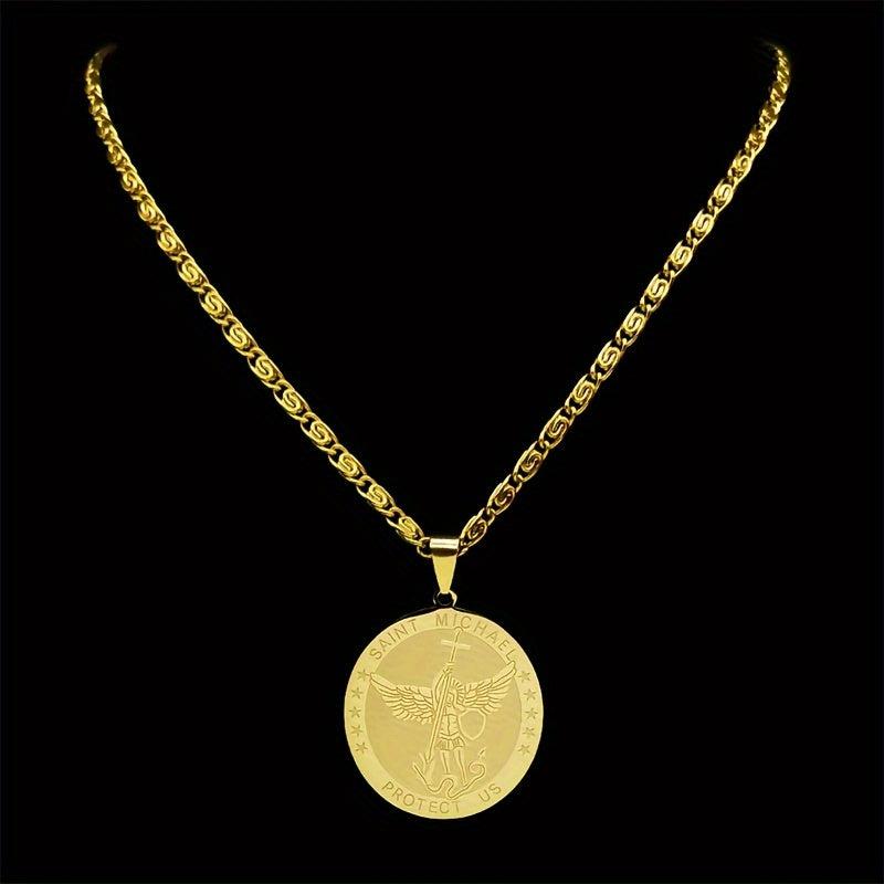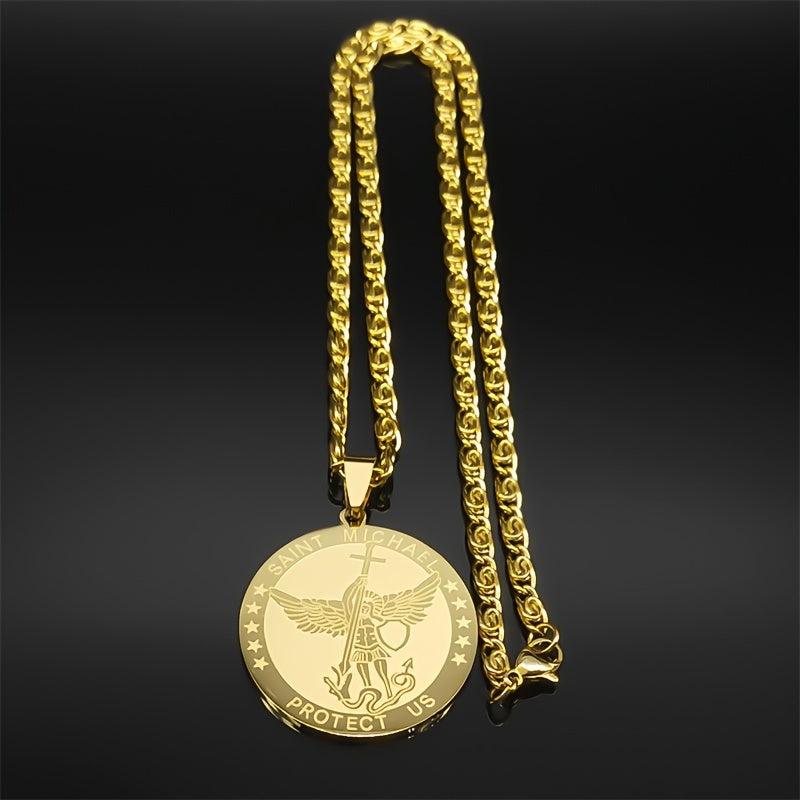 Stainless steel necklace featuring St Michael Archangel shield pendant. Ideal jewelry for men and women seeking protection. Golden tone design adds a touch of elegance.