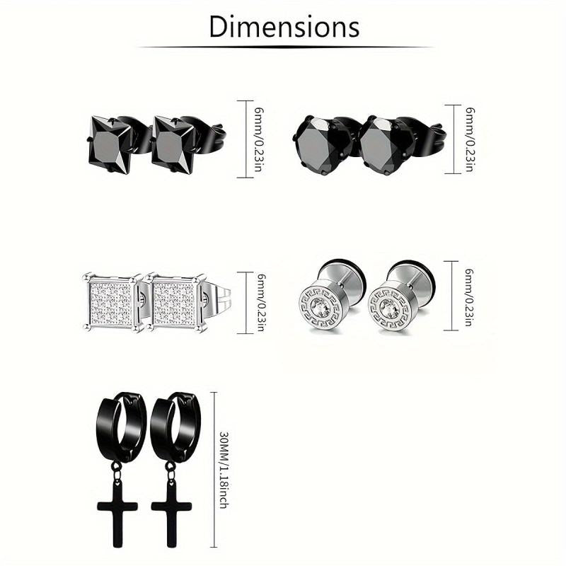 This set includes 15 pairs of stainless steel earrings suitable for both men and women. The set features cubic zirconia studs, cross dangles, and huggie hoops in silver and gold tones.