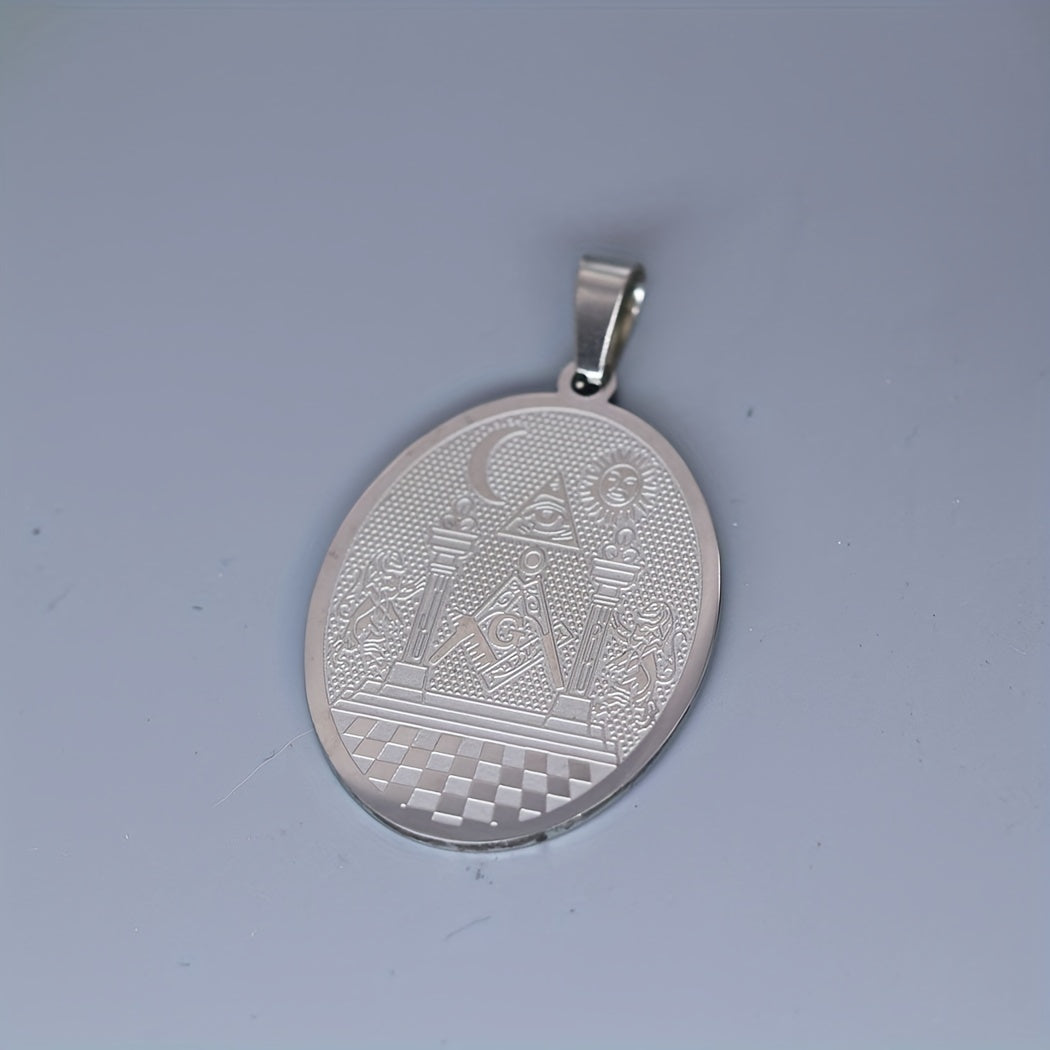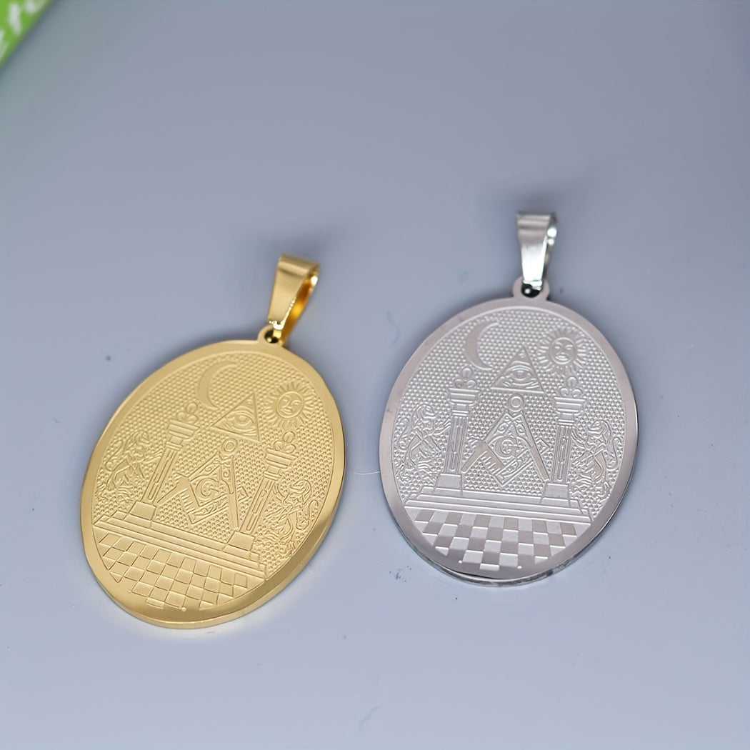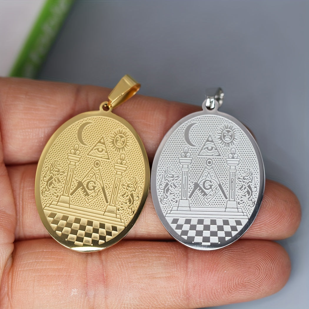 This stainless steel pendant necklace features the Masonic symbol with the Twin Pillars Boaz and Jachin design. It is a unisex amulet jewelry that is perfect for Masons and those interested in Masonic symbolism.