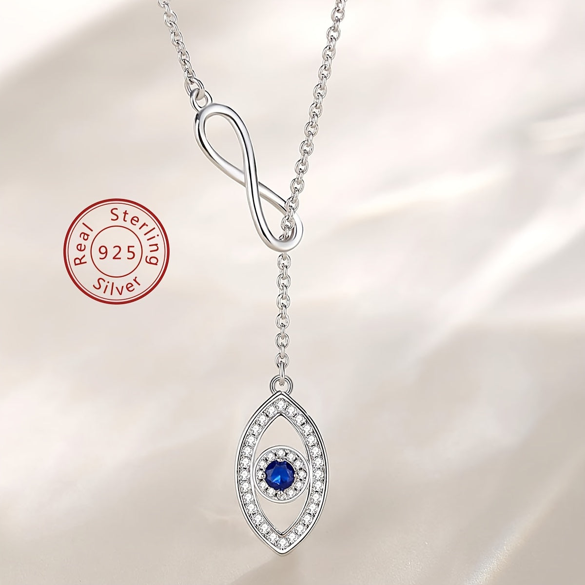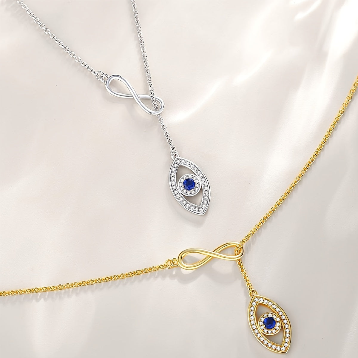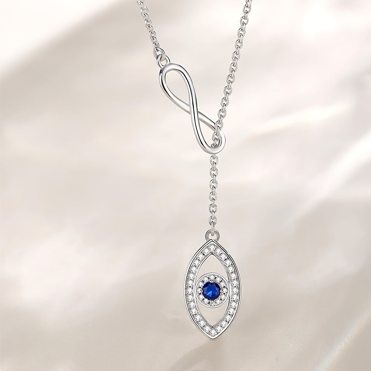 This beautiful necklace features an infinity symbol design with an evil eye pendant adorned with sapphire and zirconia. It is crafted from sterling silver for a stunning look.
