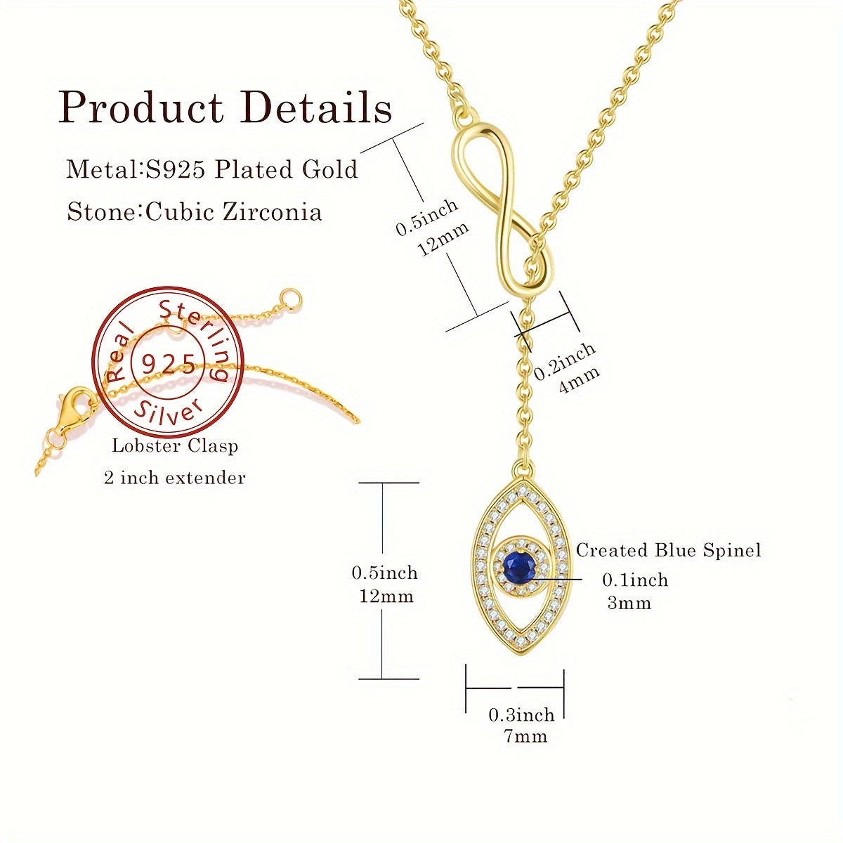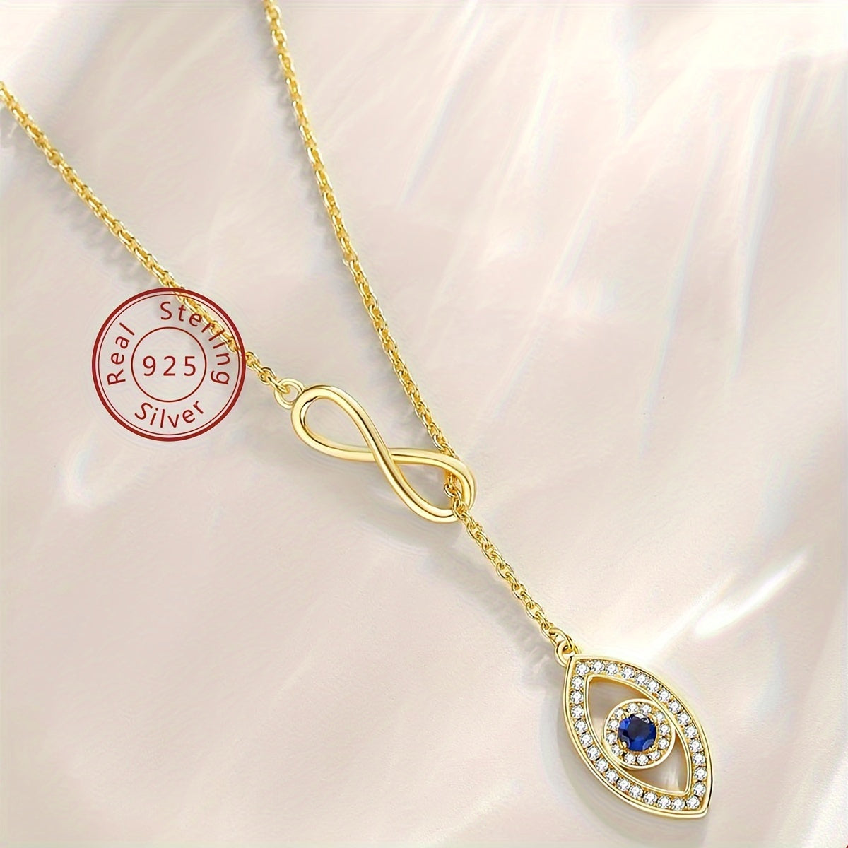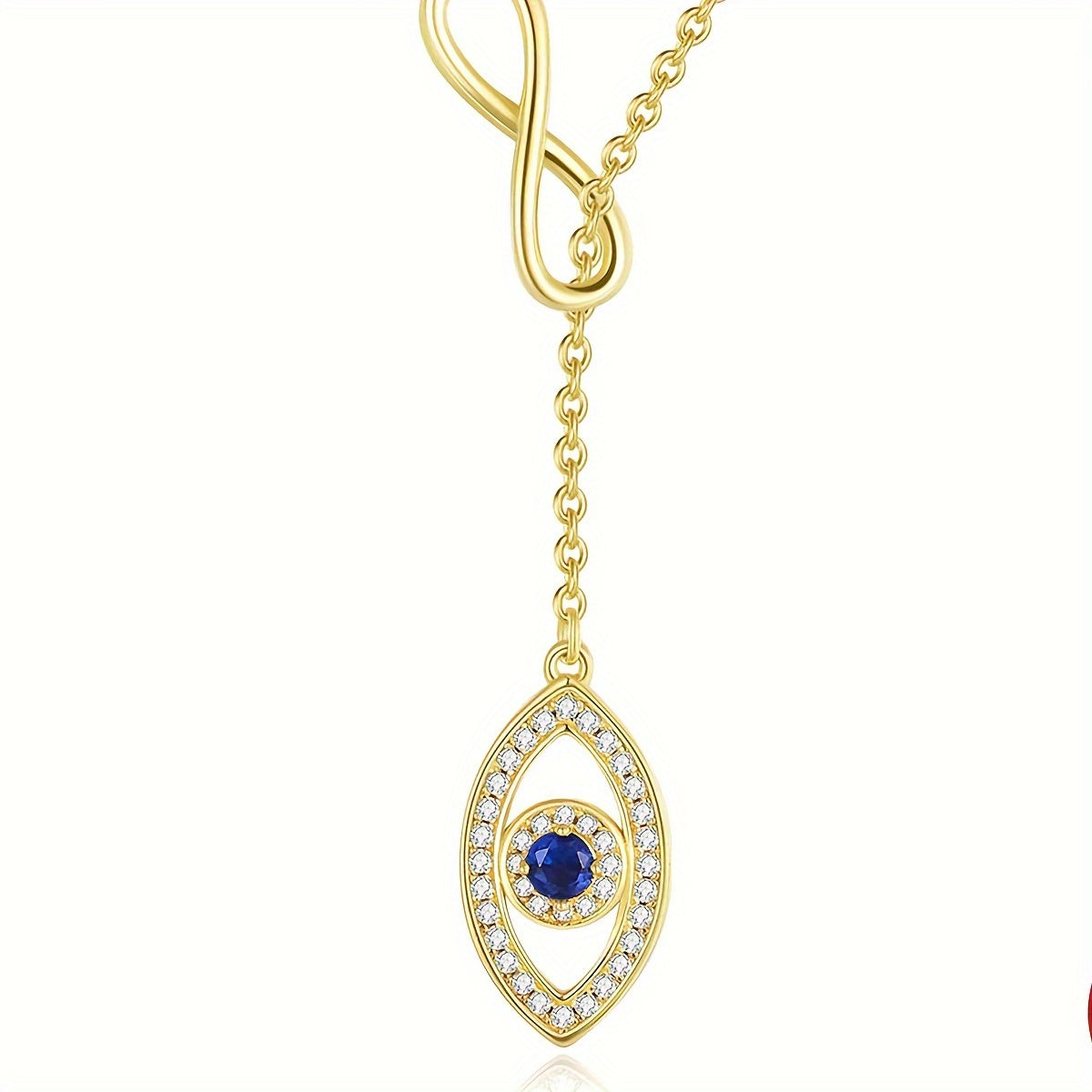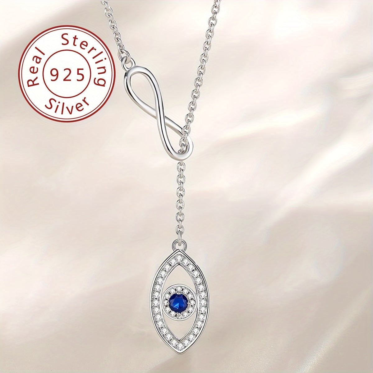 This beautiful necklace features an infinity symbol design with an evil eye pendant adorned with sapphire and zirconia. It is crafted from sterling silver for a stunning look.