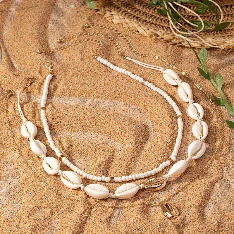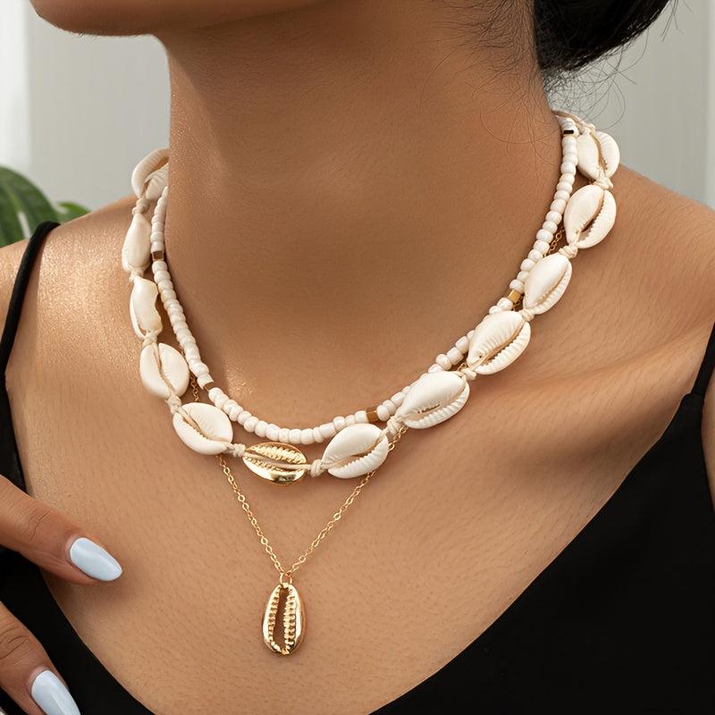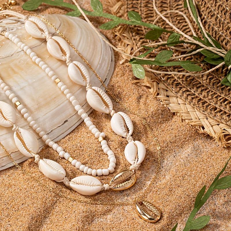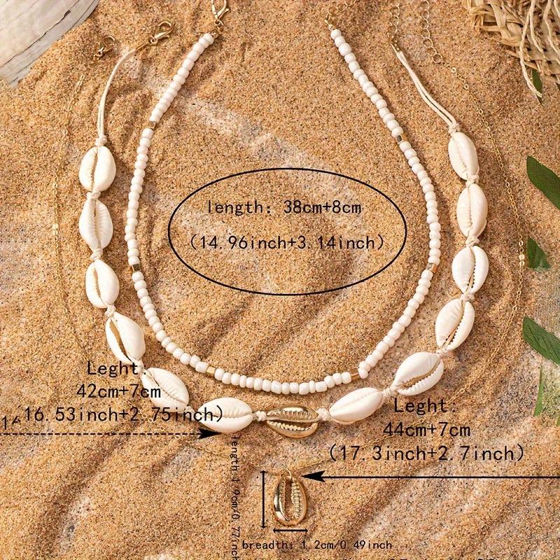 Elevate your style with this trendy necklace set featuring three layers of shells. Perfect for daily wear or vacation.