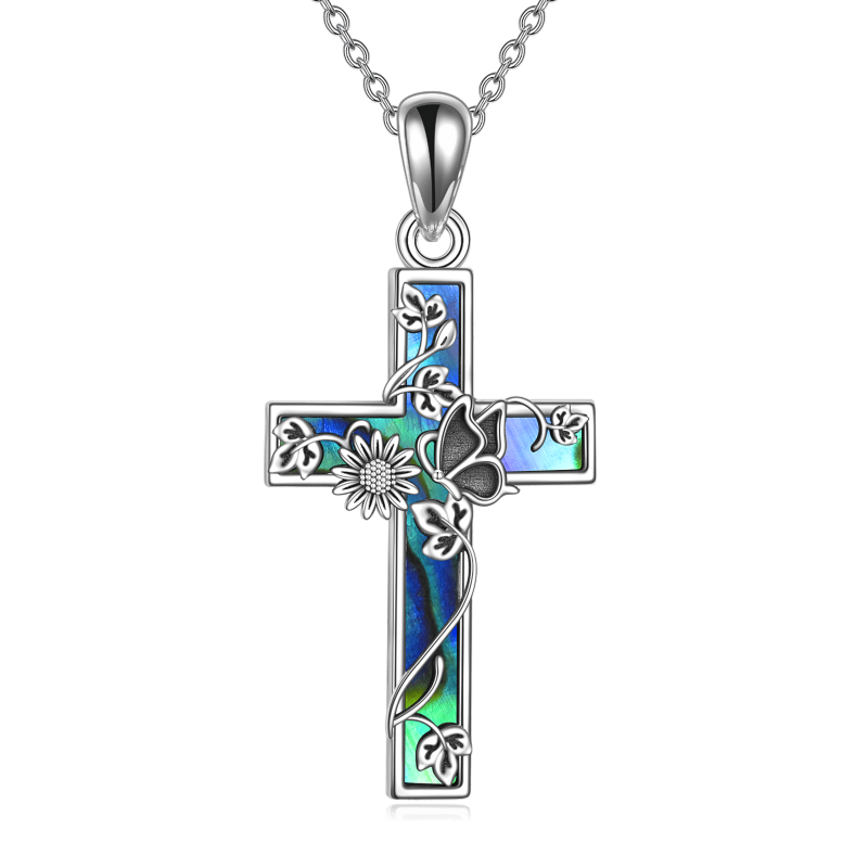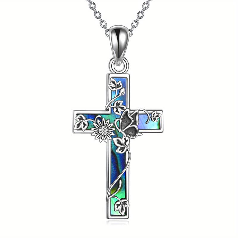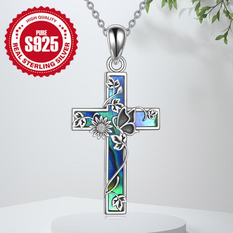 This stunning S925 sterling silver necklace features a sunflower design intertwined with a cross pendant made of abalone shell, symbolizing faith and beauty.