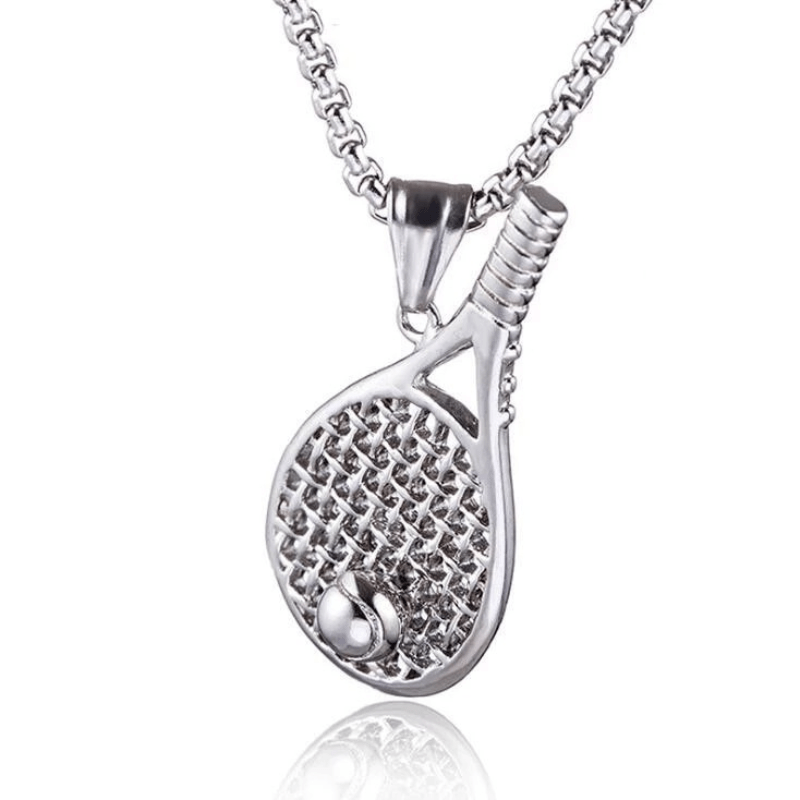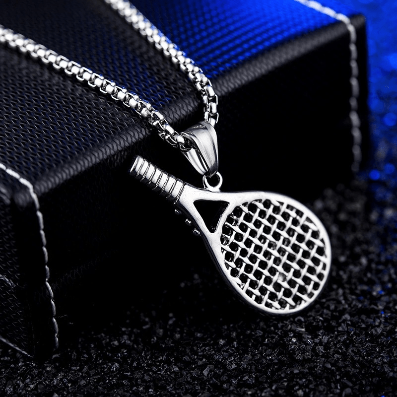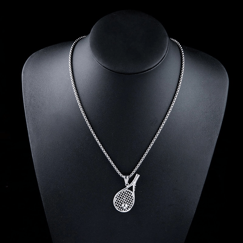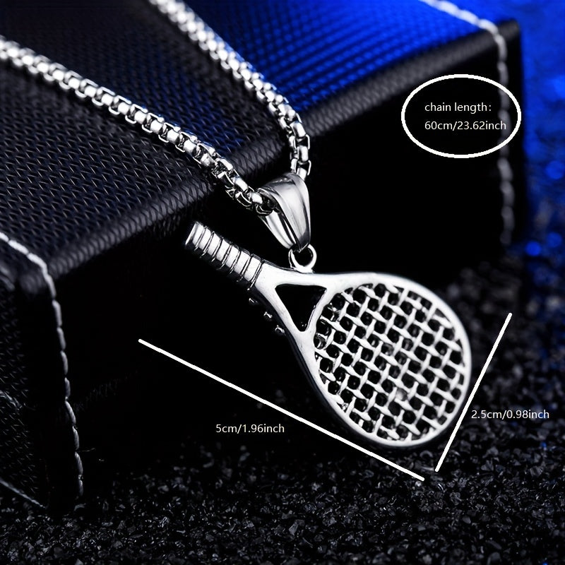 Show off your love for tennis with this stylish tennis racket pendant necklace made of titanium steel. Perfect accessory for sports enthusiasts.