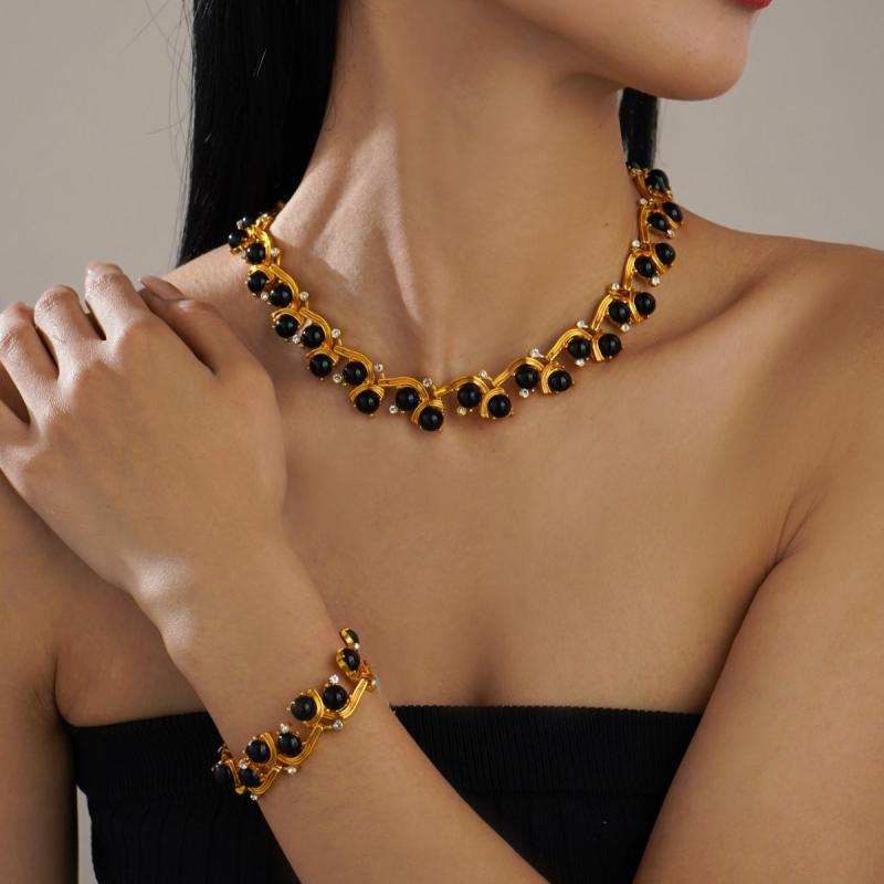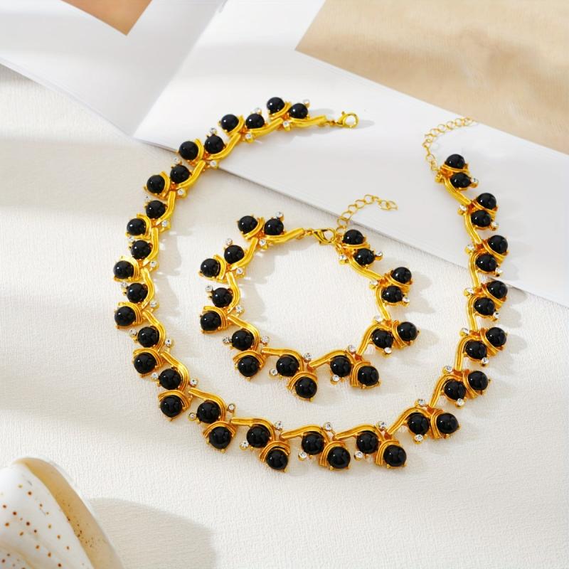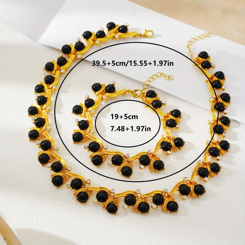 Complete your look with this stunning two-piece jewelry set featuring a necklace and bracelet. The set includes multiple metal arc lines, round beads, and rhinestones for a glamorous touch. The wave-shaped design adds a fashionable and trendy element to your ensemble.