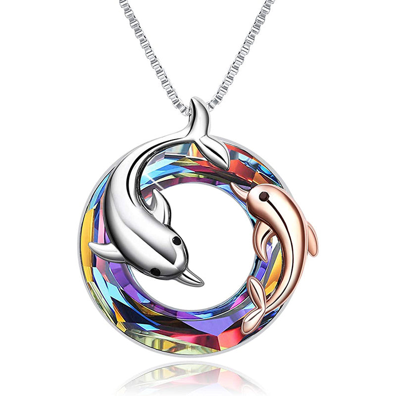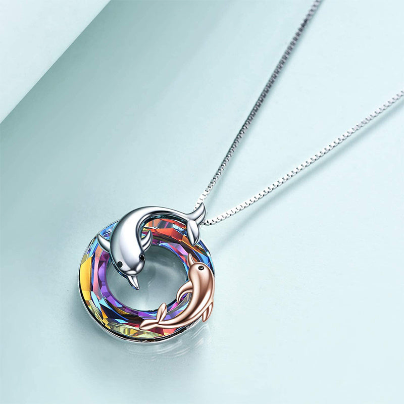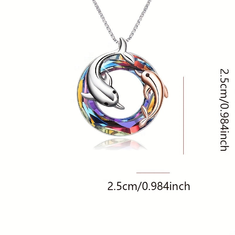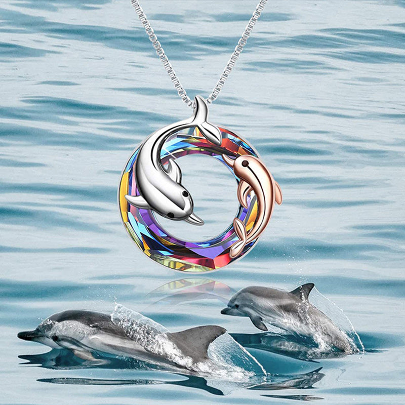 Elegant two tone dolphin pendant necklace featuring a round crystal. Perfect for animal lovers and those who appreciate unique jewelry pieces.