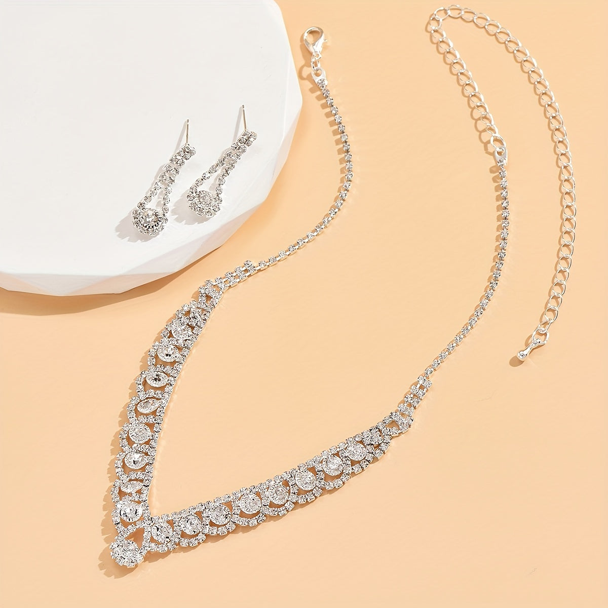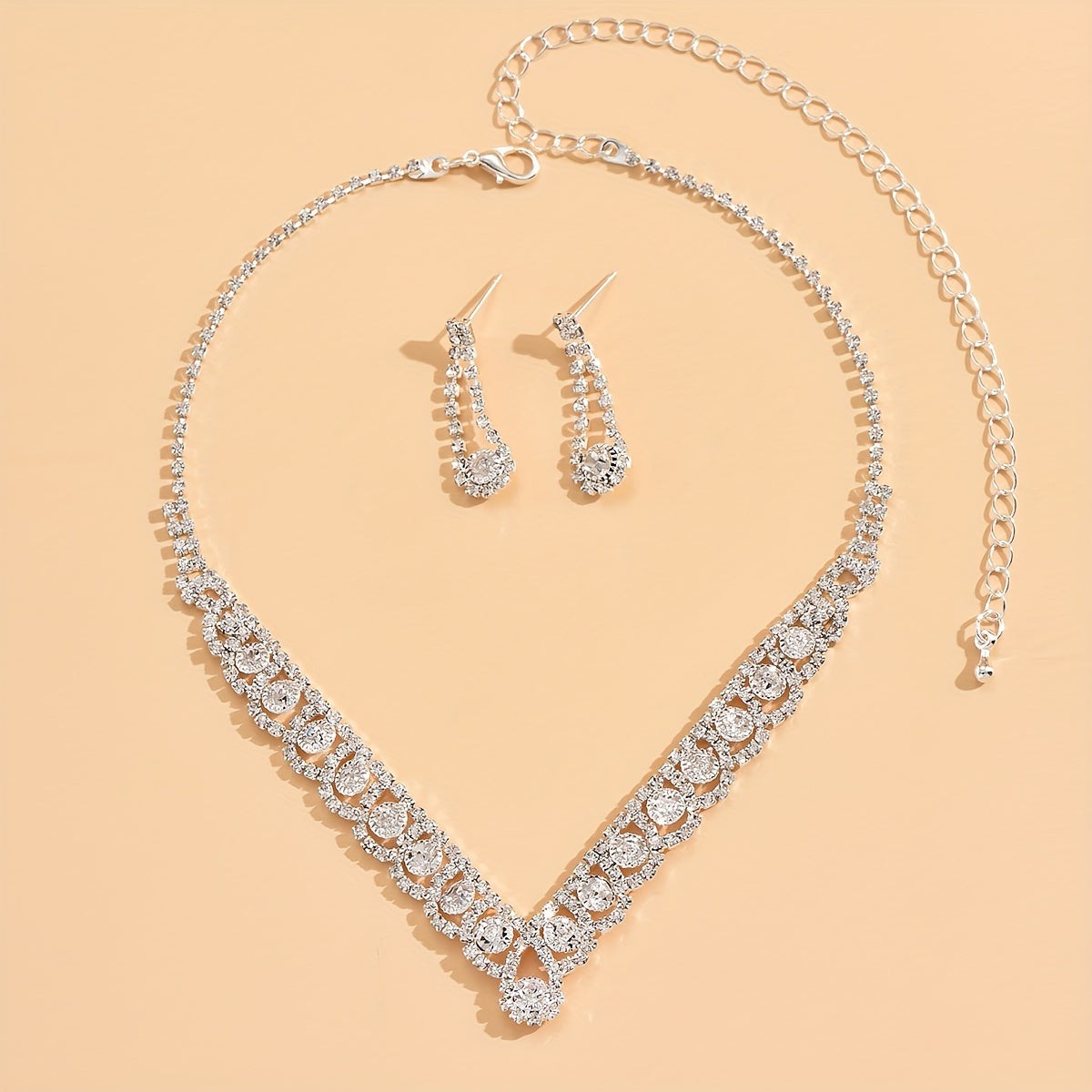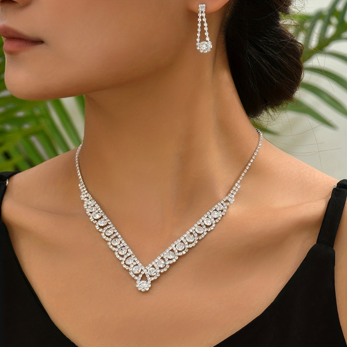 Elegant silver-plated party jewelry set featuring sparkly rhinestones in a V-shaped design.