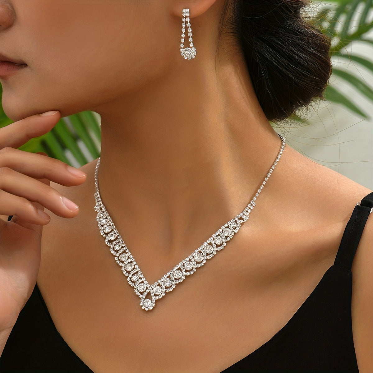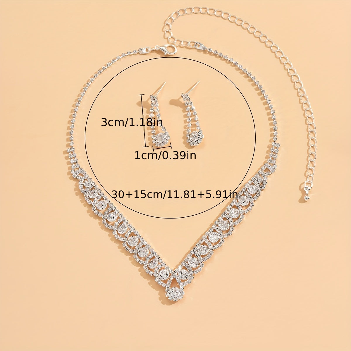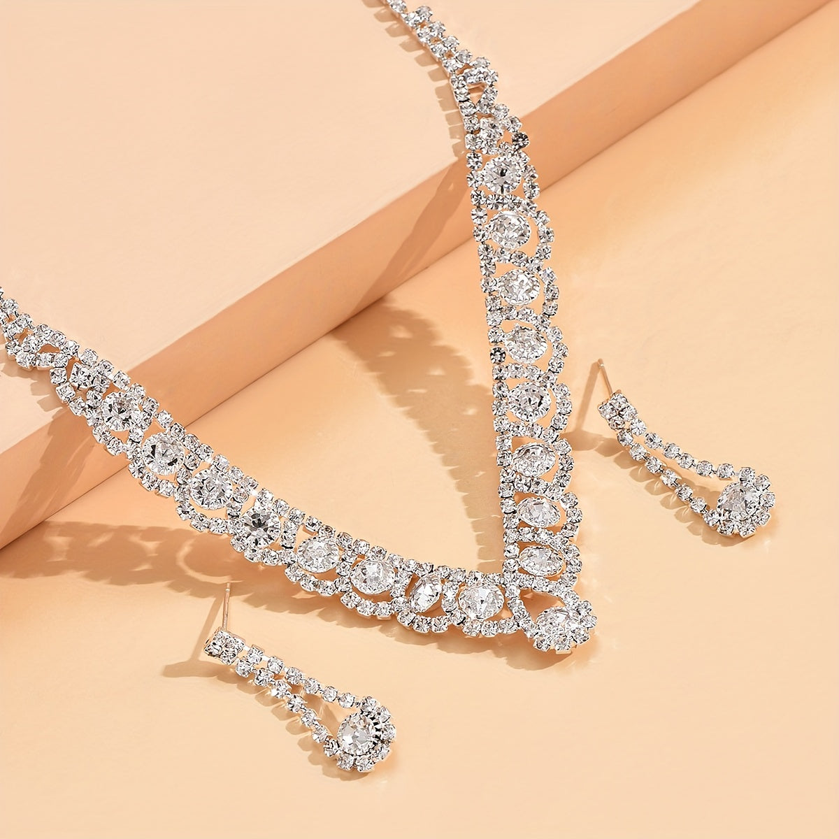 Elegant silver-plated party jewelry set featuring sparkly rhinestones in a V-shaped design.