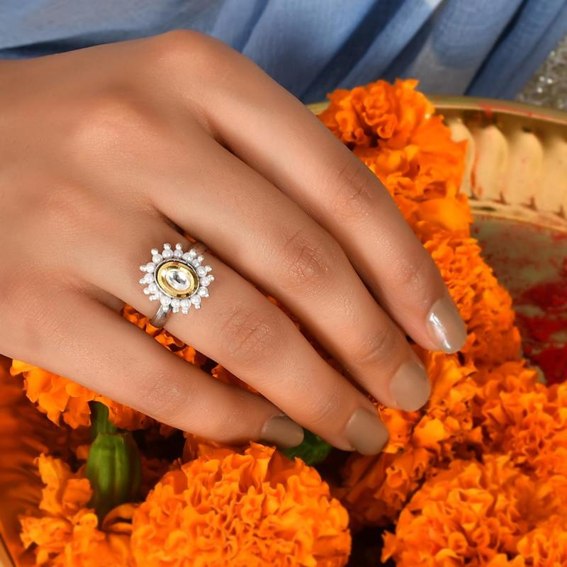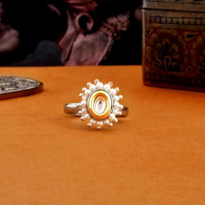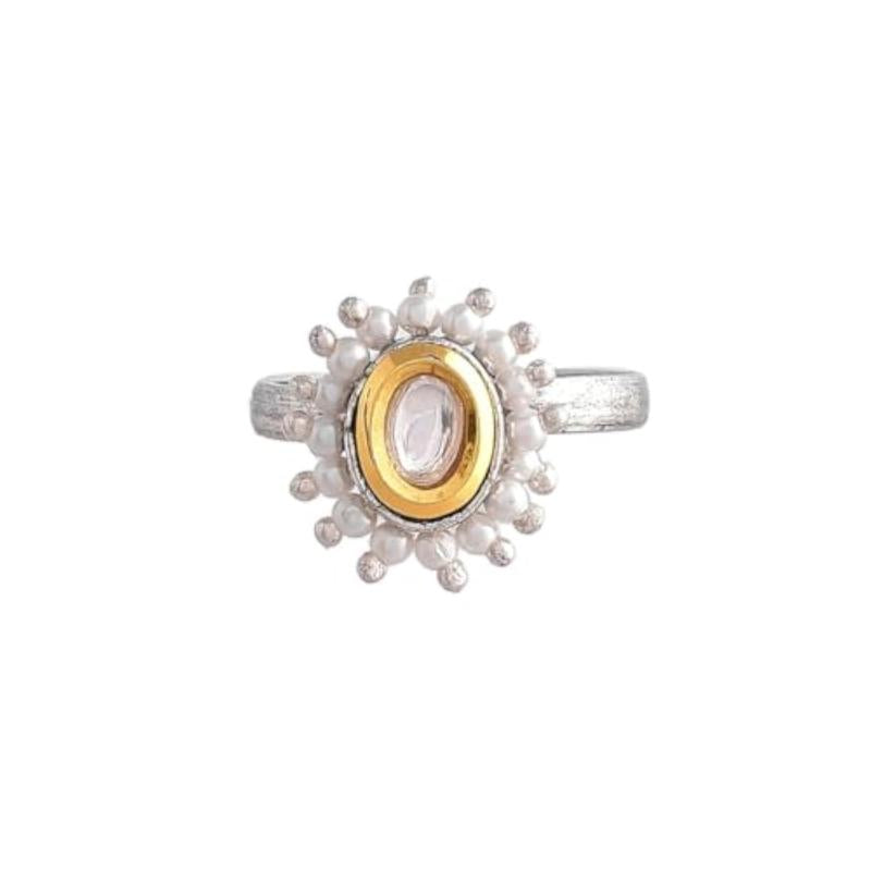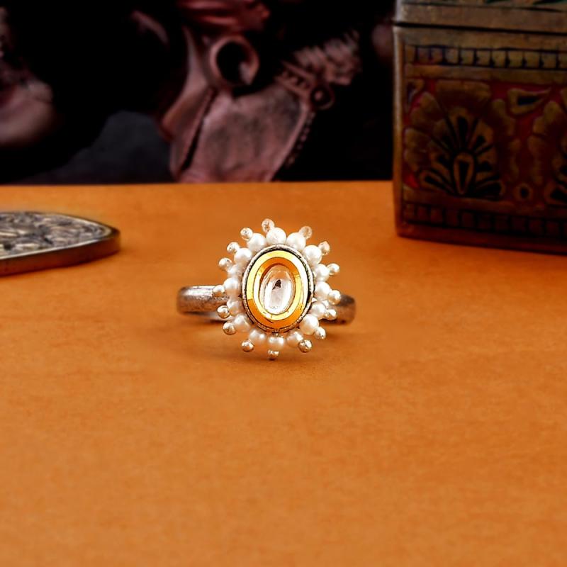 Elegant Kundan ring featuring pearls and teardrop cut design. Perfect for special occasions.