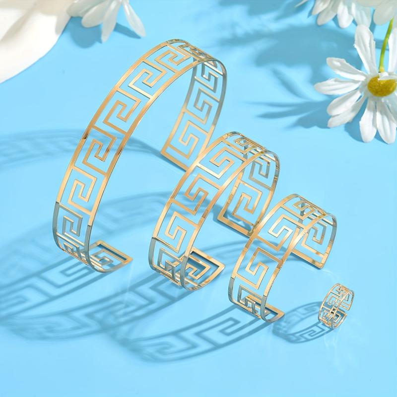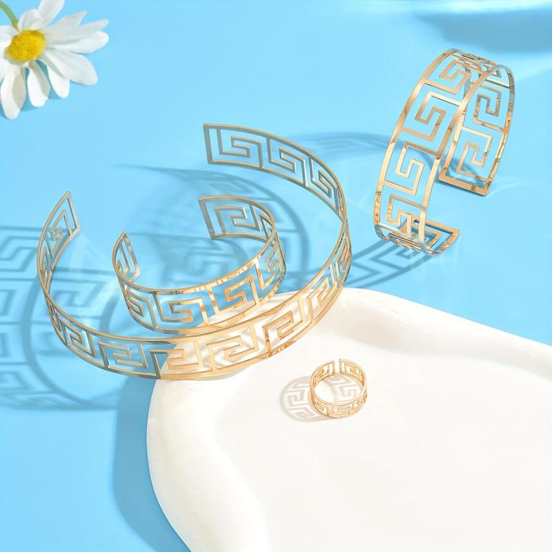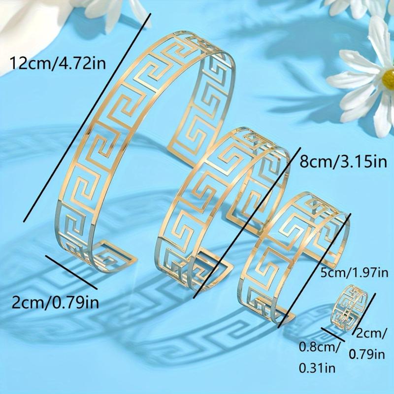 Add a touch of vintage allure with this 4-piece jewelry set including choker, bracelets, arm cuffs, and ring. Made of aluminum alloy with repeating patterns, perfect for daily wear or parties.