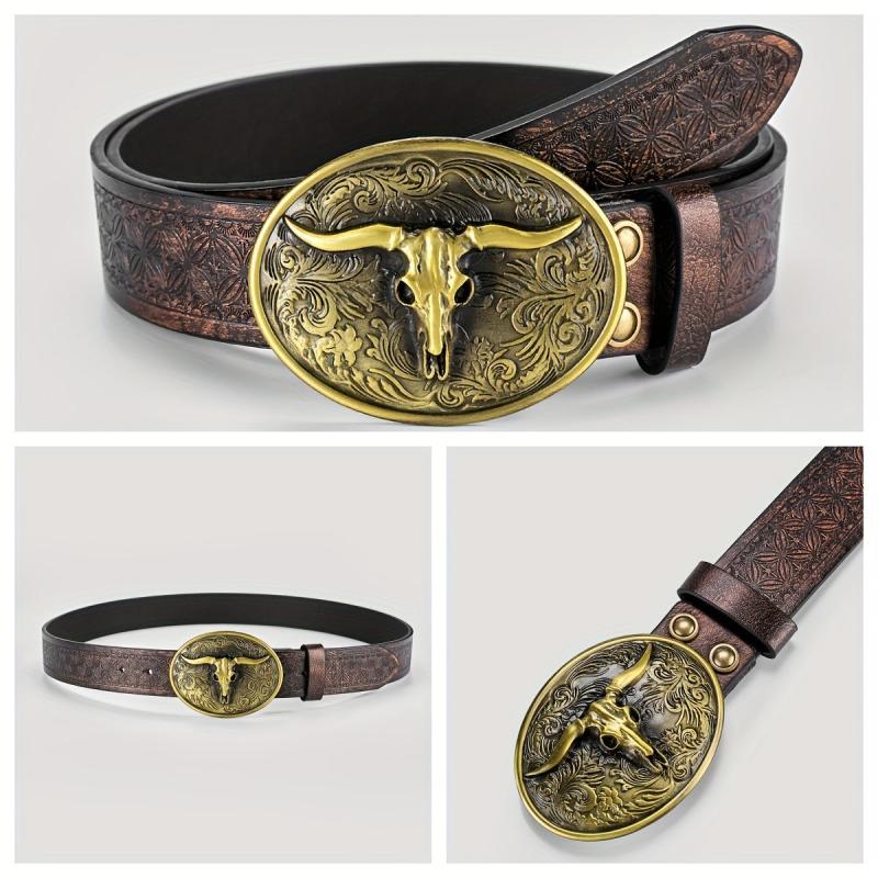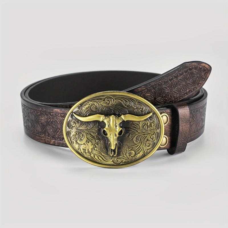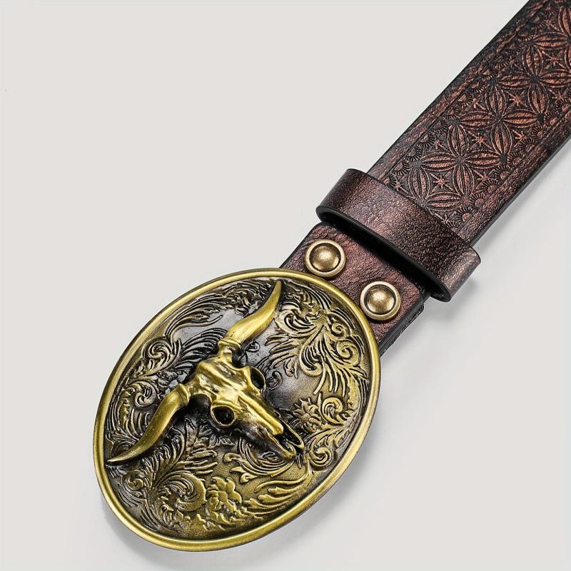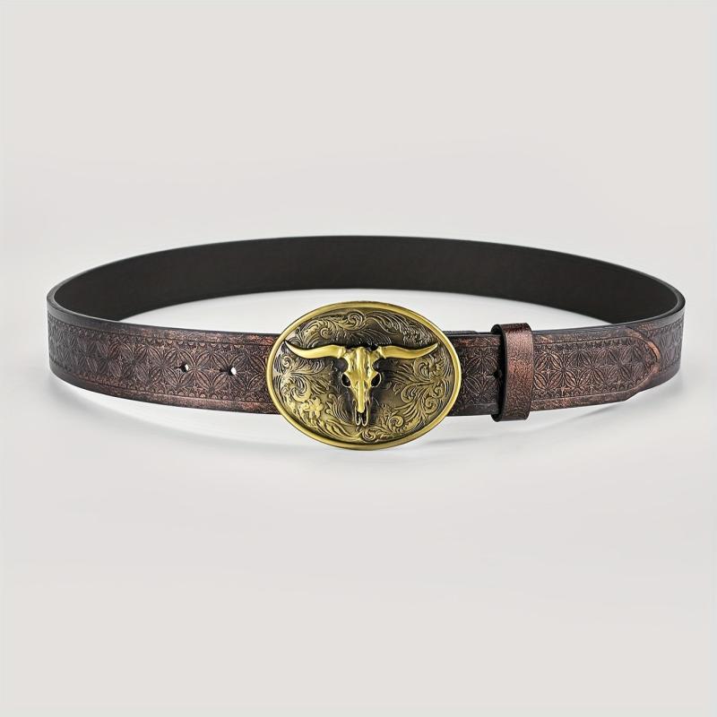 Add a touch of Western flair to your outfit with this PU leather belt featuring a decorative bull head buckle.
