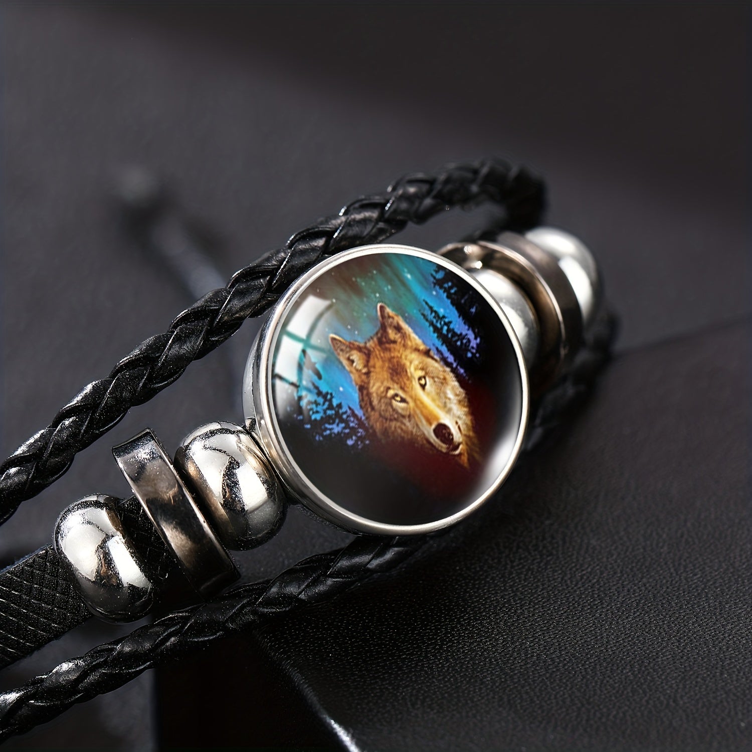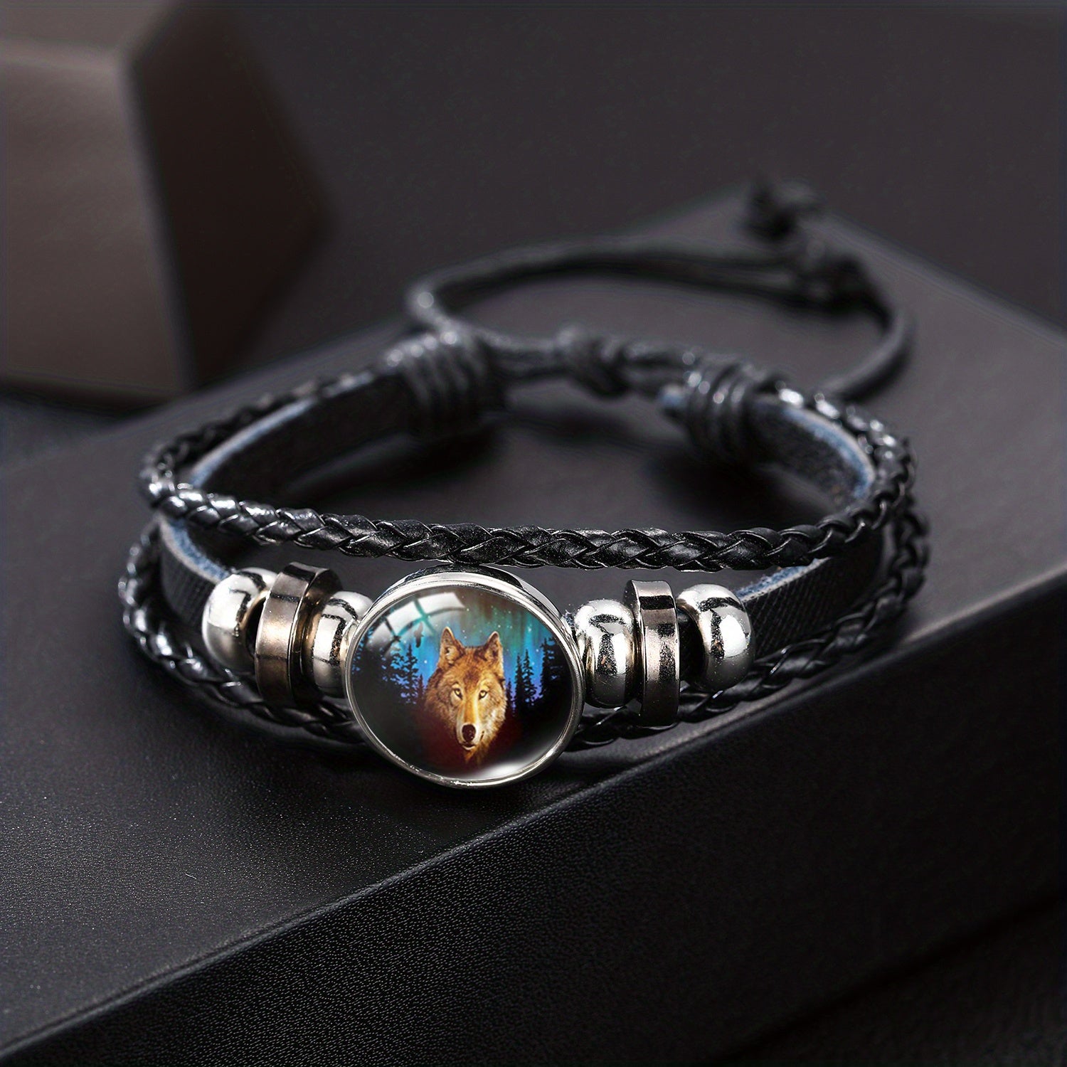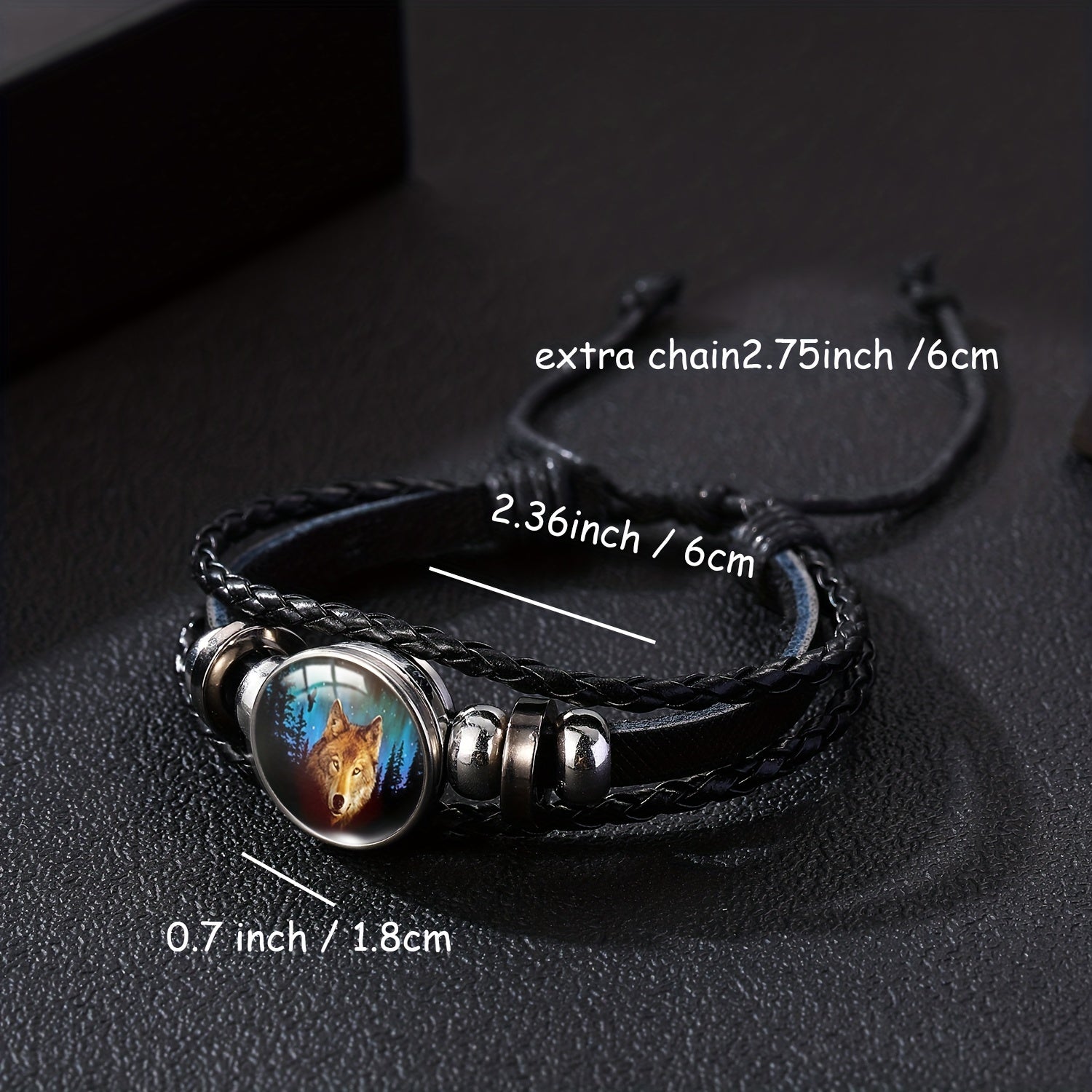 This stylish bracelet features a captivating wolf and fox portrait design. It's made of high-quality leather with a braided construction for durability and style.