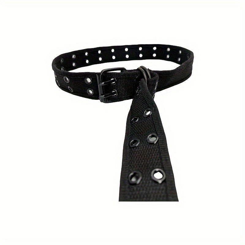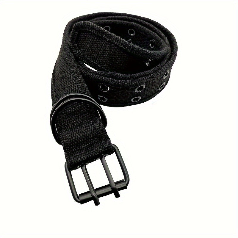 This adjustable double buckle belt for women features a casual woven design with multiple eyelets for a stylish touch. Made of durable fabric, this belt is perfect for everyday casual attire.