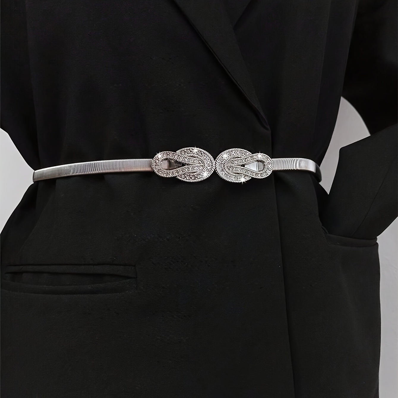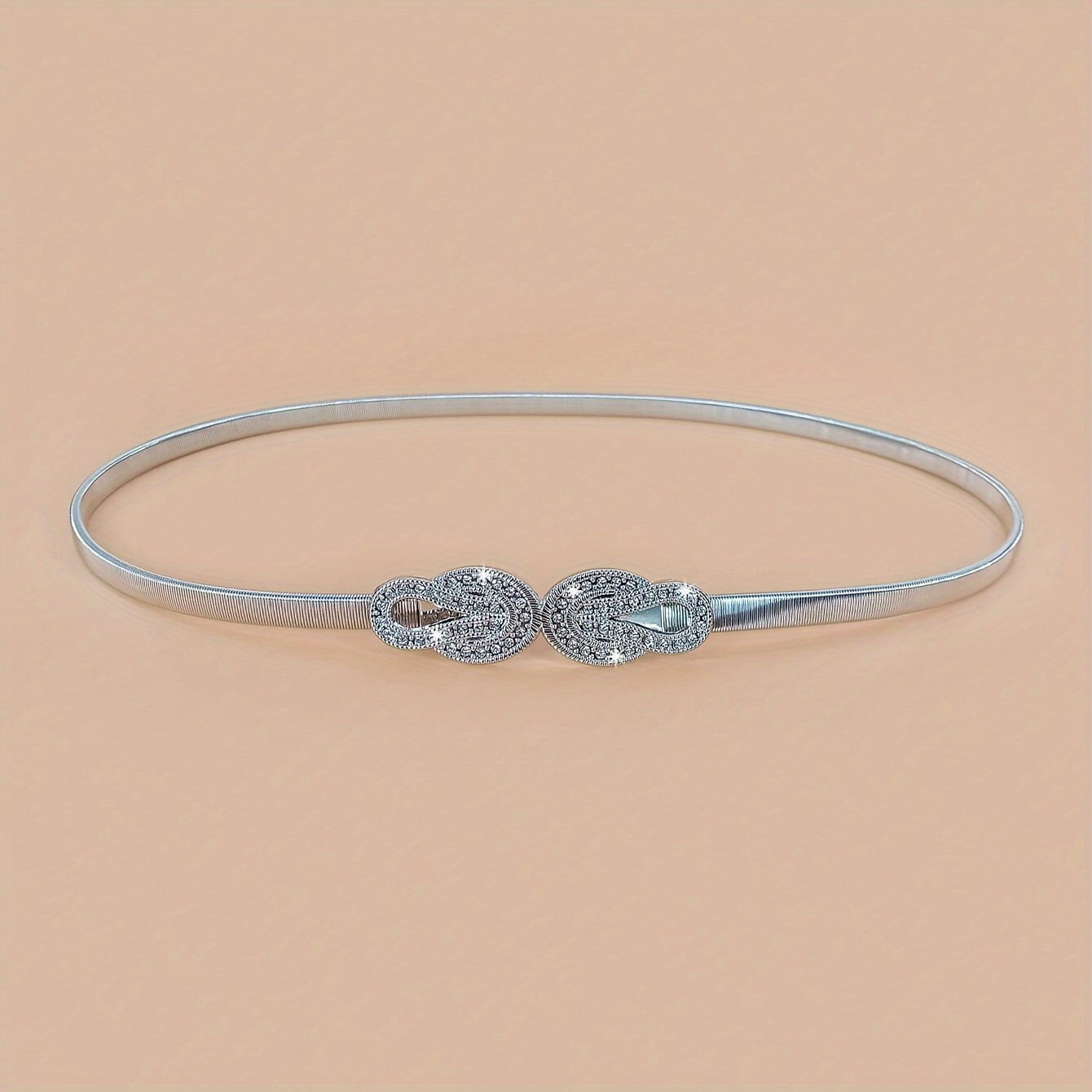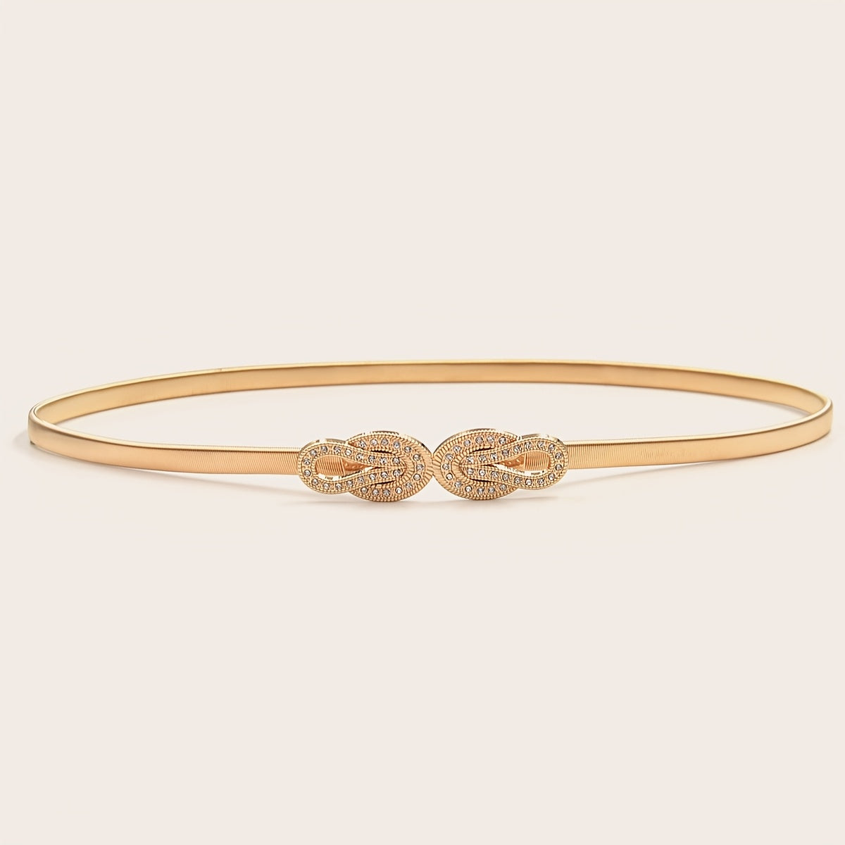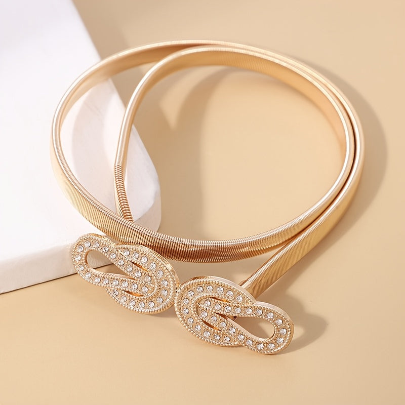 Add a touch of elegance to your outfits with this waist chain featuring twisted rhinestones and a golden hook. The elastic stretch design ensures a comfortable fit.