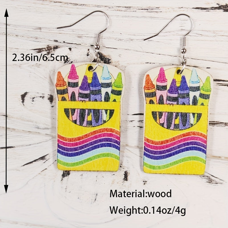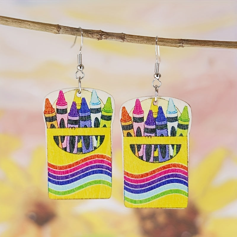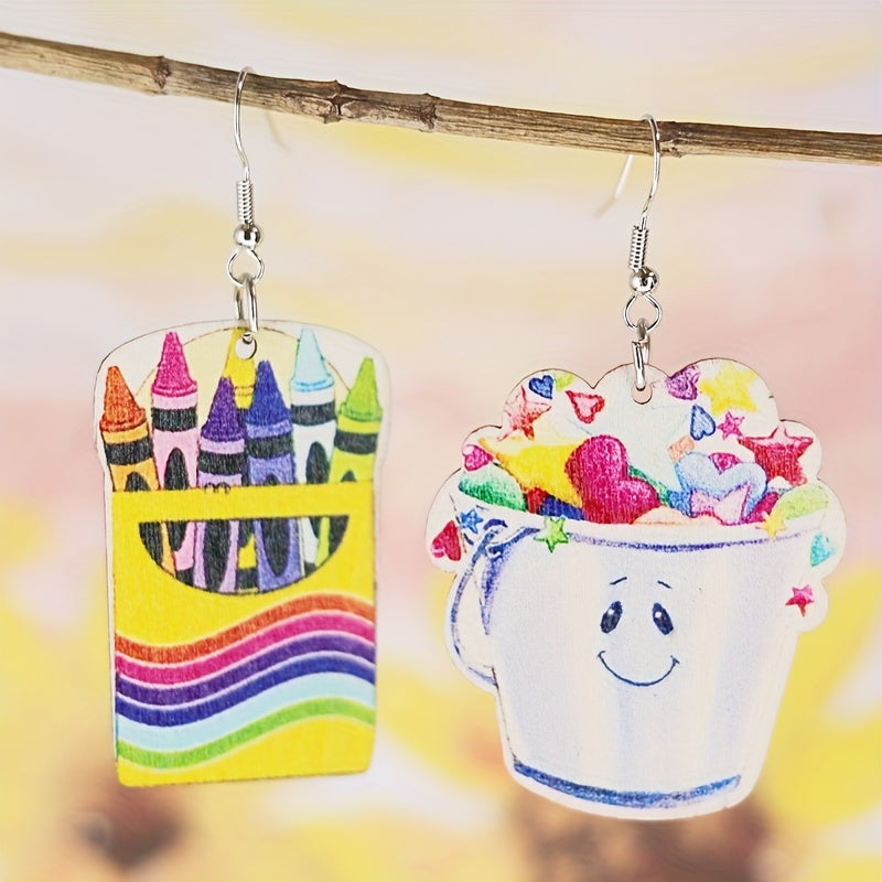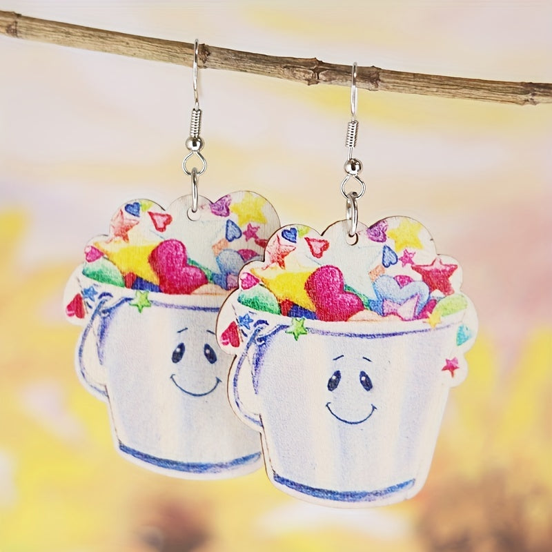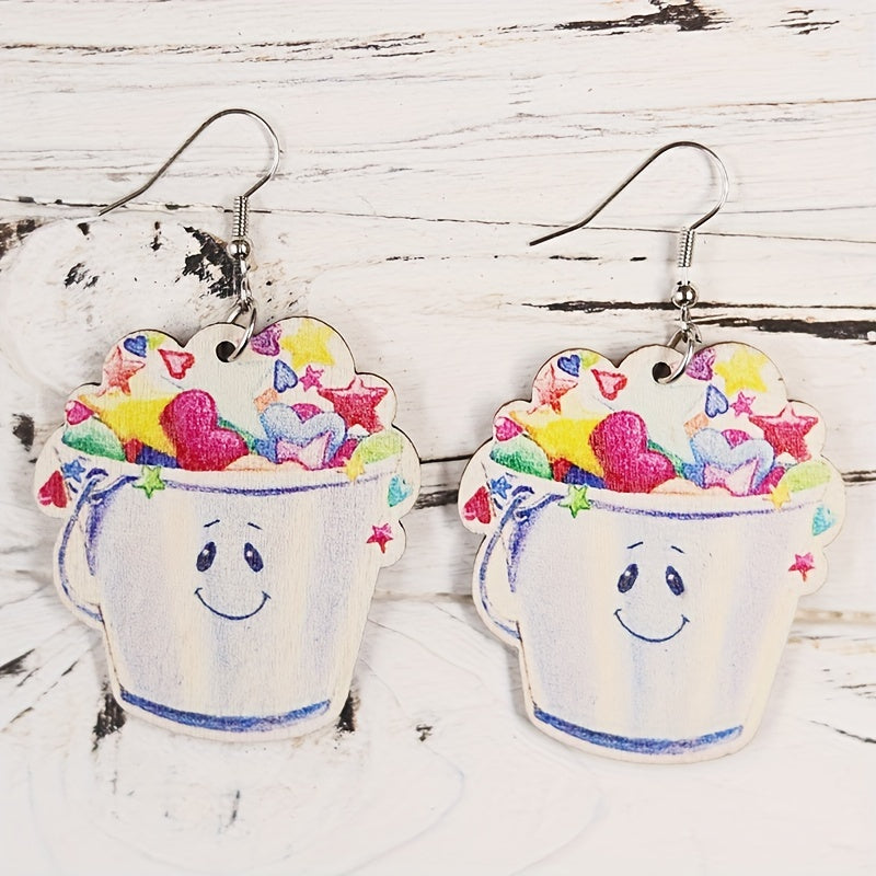 Adorable cartoon hook earrings styled like crayon ice buckets, perfect gift for women and girls. Made of high-quality wood.