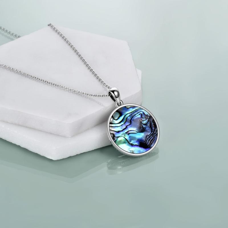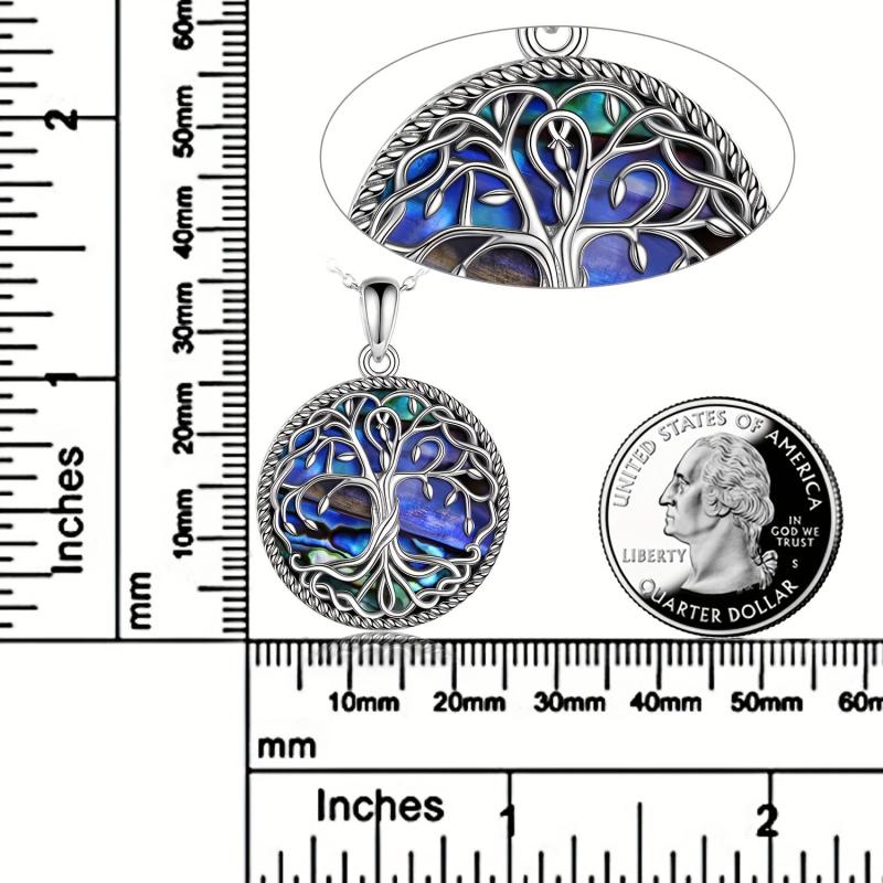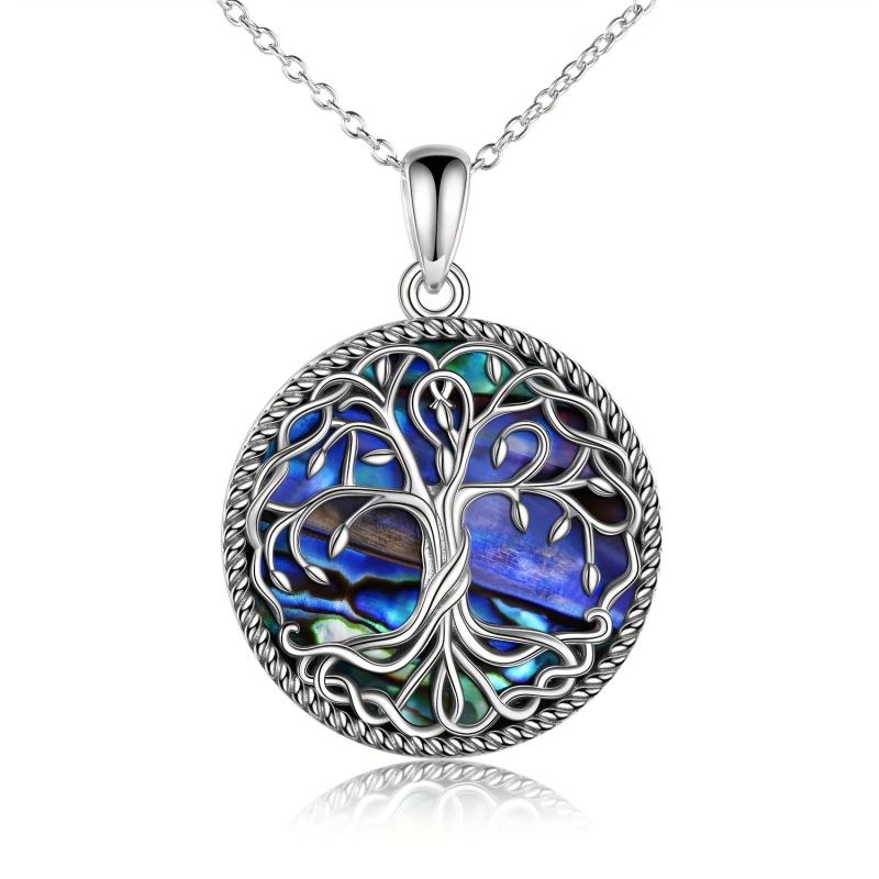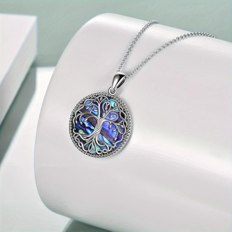 Beautiful tree of life necklace crafted from sterling silver with iridescent alabone. Features intricate Celtic knot design, symbolizing family and connection.