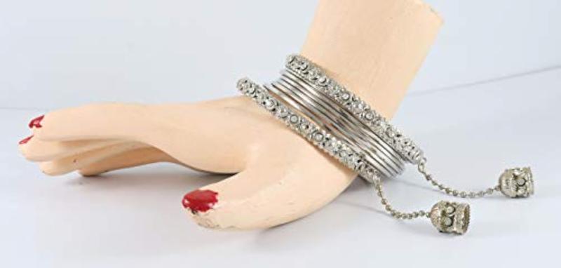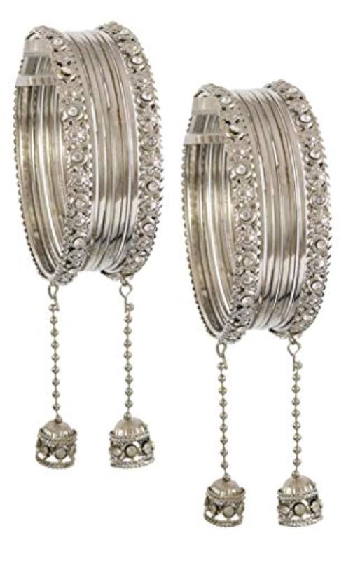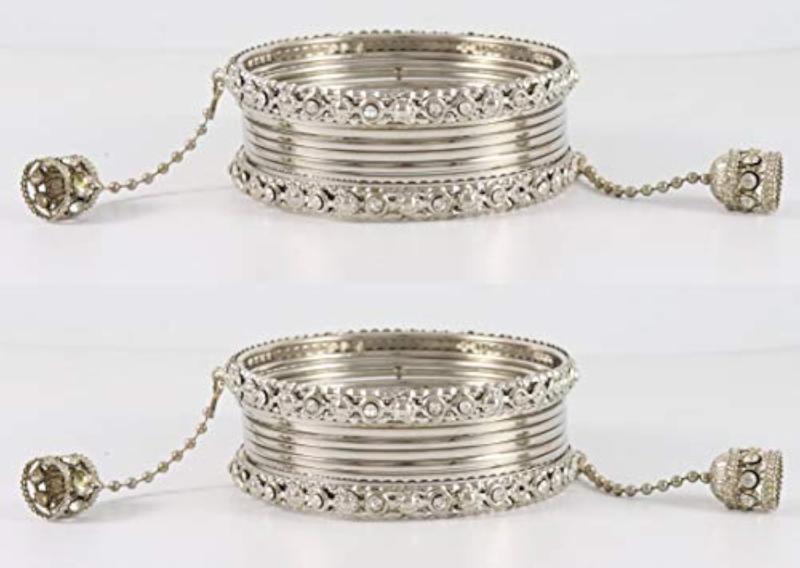 Elegant set of metal bangles featuring zircon gemstone and stylish oxidised look. Perfect for adding a touch of sophistication to any outfit.